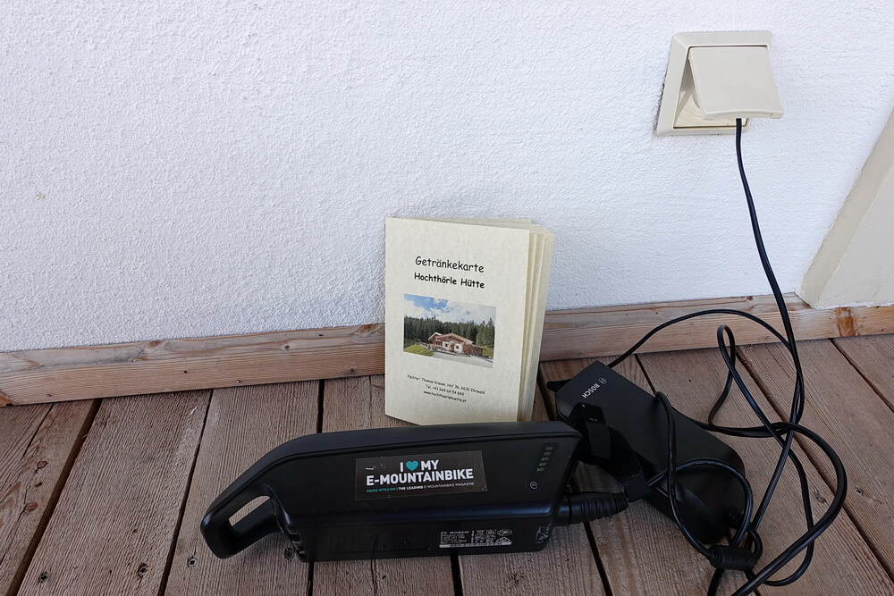 Letztlich hat es sich so ergeben, dass wir die Albrecht-Route für eMTB mit Bikes gefahren sind, die mit einem Bosch-Motor ausgestattet sind. Das ist reiner Zufall und sagt nichts über die Qualität dieses oder anderer Systeme aus. Die damals üblichen Akkus mit einer Kapazität von 500 Wh lassen unter idealen Bedingungen Fahrleistungen von deutlich über 1200 Höhenmetern im Anstieg zu. Der längste Anstieg ohne sichere Nachlademöglichkeit ist die Strecke von Grosio zum Passo Foppa/Mortirolo (siehe 4. Tag). Das sind gut 1200 Höhenmeter. Die muss man schaffen, wenn man neben dem normalen Inhalt des Rucksacks nur noch zusätzlich ein Ladegerät mit sich führen will. Das Standard-Ladegerät wiegt bei BOSCH ca. 740 Gramm und hat einen EURO-Stecker. Der funktioniert in Deutschland, Österreich, der Schweiz und Italien ohne zusätzlichen Adapter. Mittlerweile gibt es ein kompakteres Ladegerät, das nur ca. 550 Gramm wiegt (das Laden dauert aber viel länger).