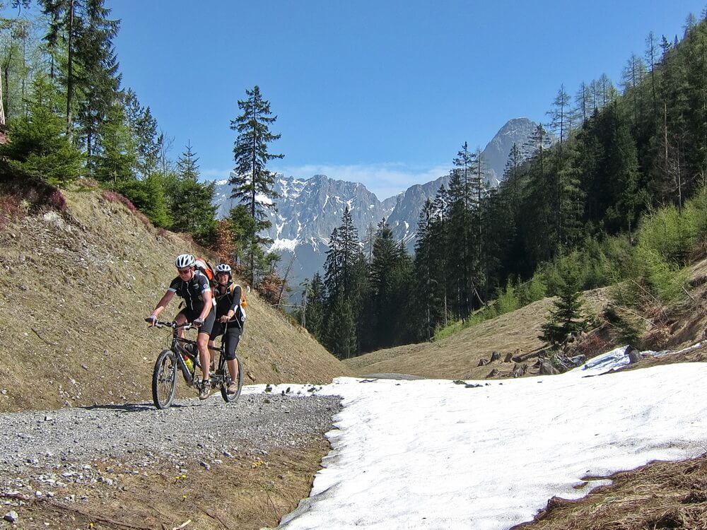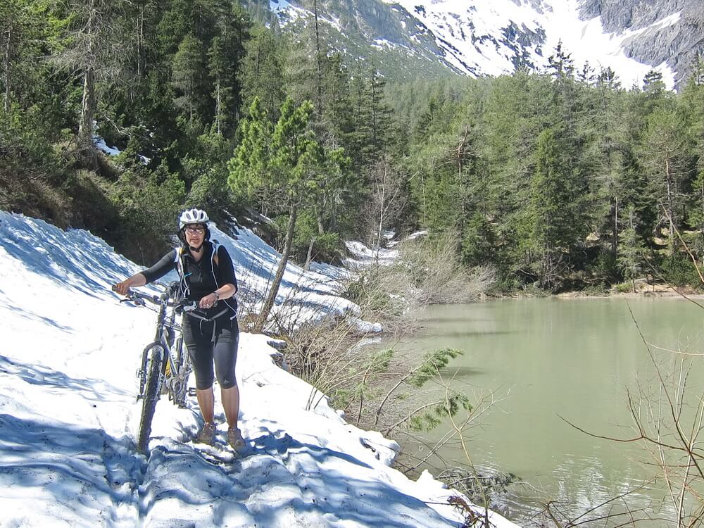 Wir fahren auf dem alten Römerweg vorbei am Weißensee hinauf zum alten Fernpass. Auch wenn der Weg etwas entschärft wurde, bleibt es doch eine Herausforderung für Simi. Wir genießen es und lassen uns Zeit, um Bilder zu machen. Ein paar Schneefelder zwingen uns sowieso zum Absteigen. Dann ist es geschafft. Ein tolles Gefühl. Mit Straßen haben wir auf der gesamten Etappe kaum etwas zu tun. Die Fernpassstraße müssen wir bei der Abfahrt nur einmal kurz überqueren, dann geht es im Gelände weiter.