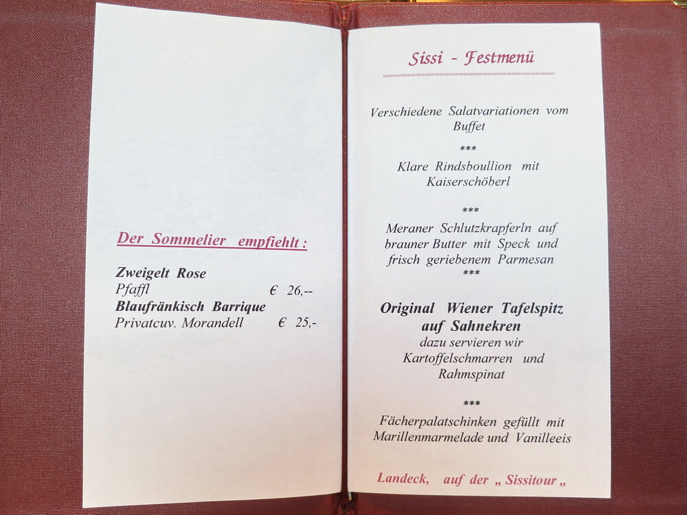 Mit Thomas, dem Hotelchef, machen wir am Abend noch ein Schwätzchen an der Bar. Dabei entwickelt sich in uns die Idee, dass zu einer Sissi-Transalp auch ein Sissi-Menü gehören sollte. Bei der guten und flexiblen Küche im Hotel Mozart ist es möglich, dass auch zu bekommen, wenn man bei dieser Tour hier einen Zwischenstopp einlegt. Wir verabreden, dass wir bis zu unserer Befahrung des zweiten Teils der Strecke ein Sissi-Menü in 5 Gängen zusammenstellen werden. Gesagt, getan. Wir recherchieren ein wenig in verschiedenen Büchern und werden bald fündig. Bei unserem nächsten Besuch steht die Speisenfolge fest und wir sind die Testesser.