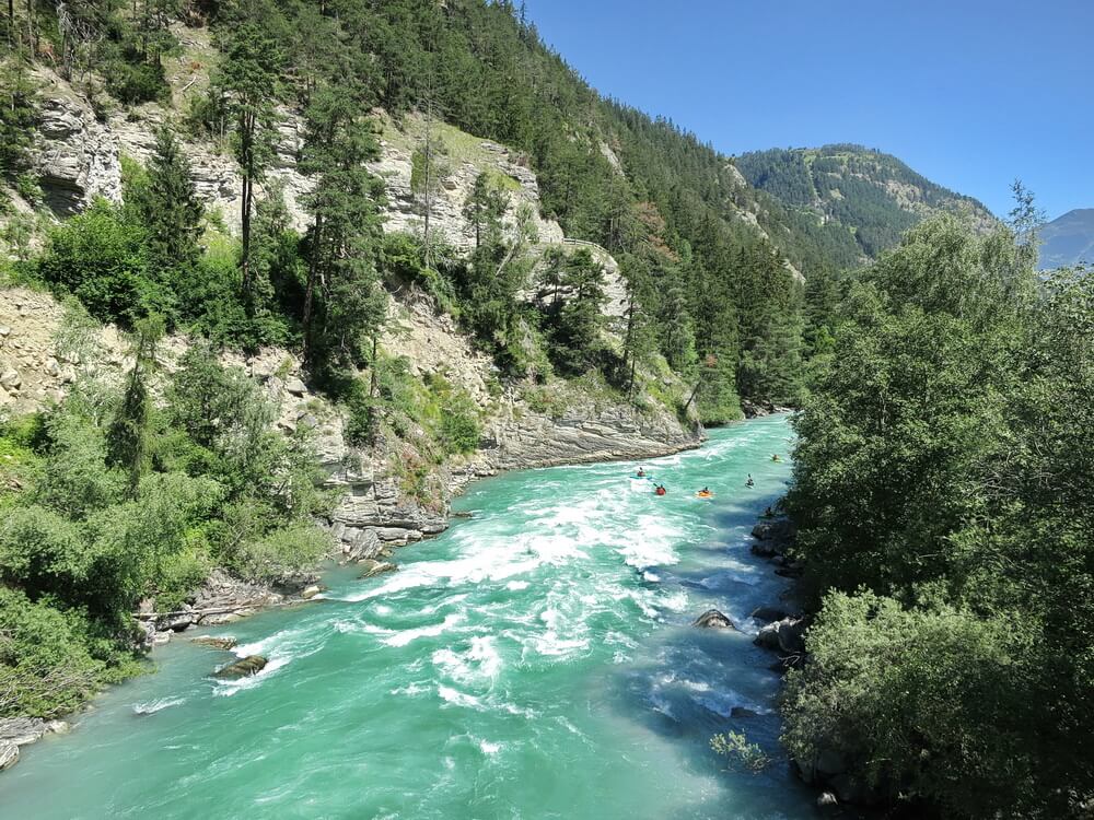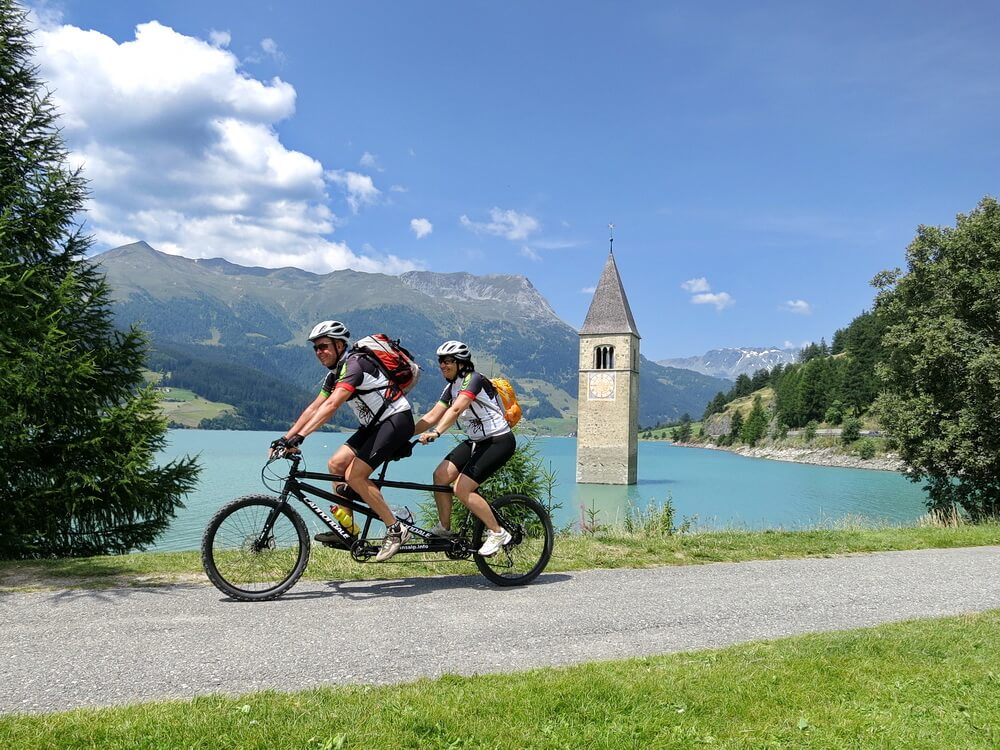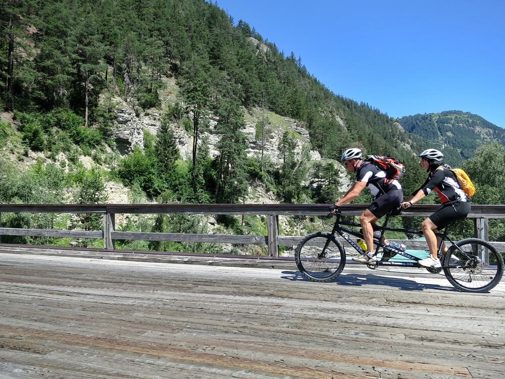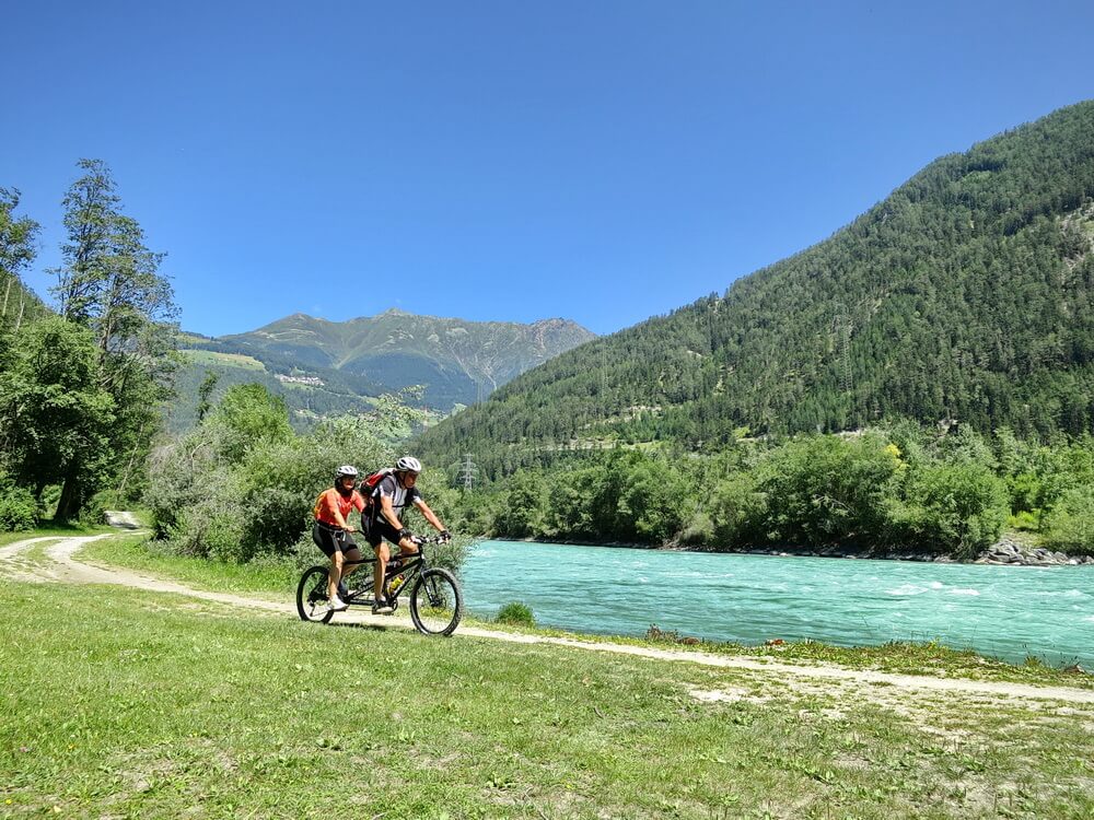 In Landeck geht es los auf dem Inn-Radweg. Als Etappenort hatten wir ja Glurns im Vinschgau angepeilt. Dort habe ich vorsorglich eine Unterkunft reserviert. Ebenso für den folgenden Tag in Meran, danach nicht mehr, und das hat auch funktioniert. Der Inn-Radweg ist sehr gut ausgeschildert, so dass man sich eigentlich nicht verfahren kann. Bis Prutz bleiben wir auf dieser Trasse. Hier verlassen wir aber den Radweg, der ansonsten durch den Ort führt. In Richtung Ried gibt es für unser Mountainbiketandem eine schöne Strecke direkt am Inn entlang. Die einfache Schotterpiste erreicht bei Ried den Abzweig nach Serfaus. Wir ersparen es uns, in den Ort hineinzufahren, sondern bleiben auf einer Nebenstrecke parallel zur Bundesstraße. Den neuen Radweg aus Ried heraus in Richtung Pfunds erreichen wir nach ca. anderthalb Kilometern. Dort untertunnelt er die Bundesstraße. In Richtung Altfinstermünz gibt es jetzt einen neuen Radweg. Erst in Vinadi müssen wir wieder auf die Straße wechseln. Die Abfahrt nach Martina geht dann rasant. An der Schweizer Grenzstation winken die Zöllner unser Tandem durch. Bei unserem spärlichen Gepäck ist es glaubhaft, dass wir keine Schmuggelware mit uns führen. Wir passieren die Brücke über den Inn, halten kurz an und bereiten uns auf die längste zusammenhängende Auffahrt dieser Transalp vor. Sie beträgt gut 400 Höhenmeter mit einer moderaten Steigung, verteilt auf eine Länge von ca. sechs Kilometern. Ich kenne die Strecke und weiß, wie wir uns die Kräfte einteilen werden. Ein paar Rennradler überholen uns unterwegs, wir kommen auch gut voran und sind nach einer reichlichen Stunde an der Norbertshöhe. Die Abfahrt geht geschwind und in wenigen Minuten sind wir in Nauders. Dort liegt ein M-Preis genau am Weg. Wer es noch nicht kennt: M-Preis ist eine Tiroler Supermarktkette, stets mit angeschlossenem Imbiss. Sehr zu empfehlen für reisende Radler. Die Rast haben wir uns verdient. Ein kurzer Stich noch an der Burg Nauders vorbei und dann ist es fast schon geschafft. Moderat ansteigend schlängelt sich der Radweg durch die Wiesen in Richtung der Grenze zu Südtirol.