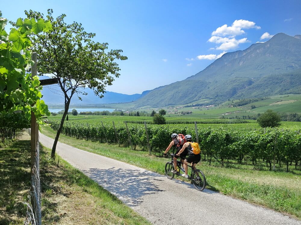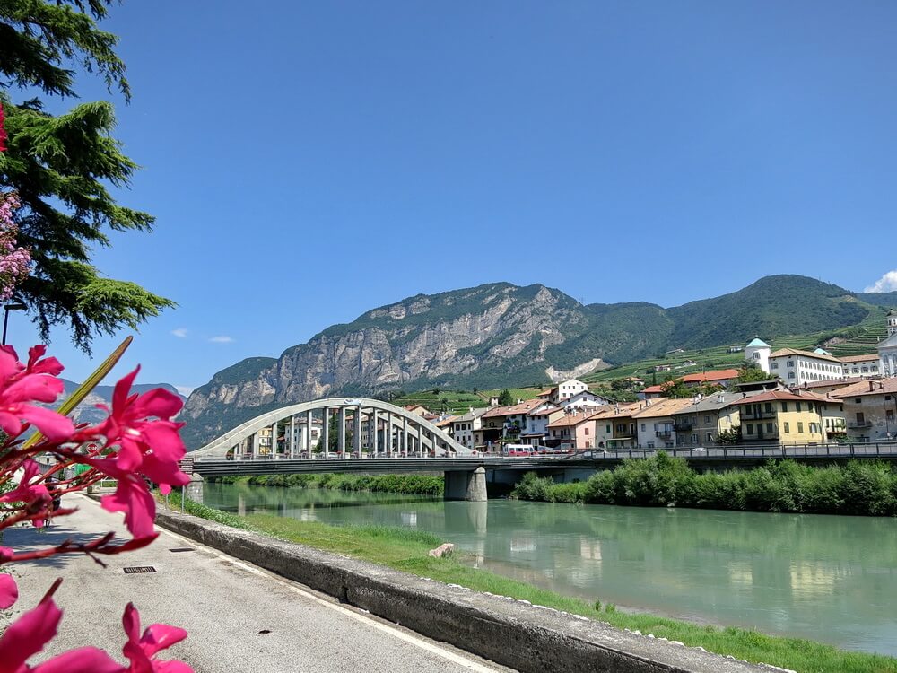 Wir erreichen den Kalterer See etwas oberhalb bei Klughammer und fahren weiter in Richtung Etschradweg. Bald passieren wir das schöne alte Städtchen Neumarkt, das man auf einem Stichweg erreichen könnte. Eindrucksvoll sind dort die Laubengänge im historischen Ortszentrum. Da es immer heißer wird, steht uns jetzt allerdings nicht der Sinn nach einer erneuten Pause. Der Radweg führt uns hinter Salurn aus Südtirol hinaus ins Trentino. Der Abschnitt bis Trento entpuppt sich als recht zäh. Zum Glück haben wir keinen Gegenwind, der hier manchmal recht heftig wehen kann.