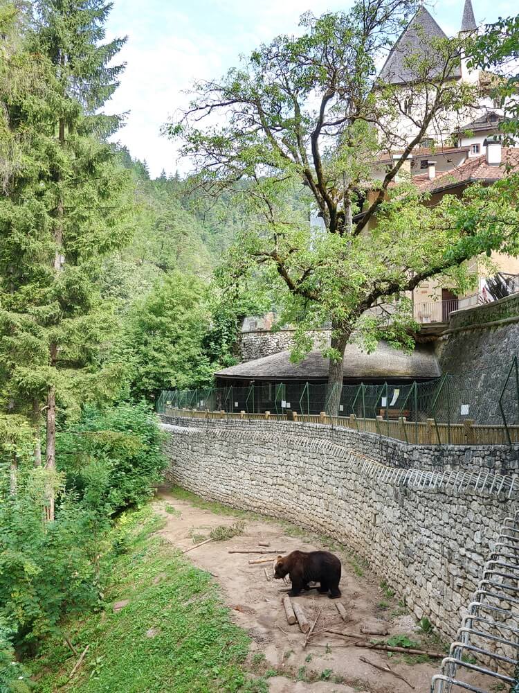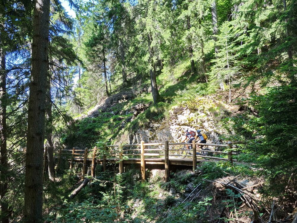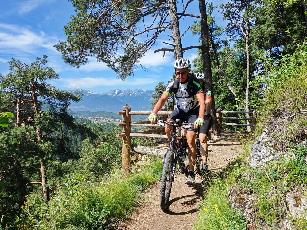 Bergab haben wir mit der Straße auch nichts zu tun. Abwärts führt ein Radweg nach Ruffrè, gefolgt von einem sensationellen Trail. Nahezu höhengleich verläuft der in Richtung Cavareno. Bei guter Sicht erhascht man einen Blick auf die Brenta-Gruppe. Der markante Bergstock zwischen Andalo und Madonna di Campiglio gilt als die Wiege des Alpinismus. Bei den ersten Häusern von Cavareno halten wir uns links und erreichen bei einer Wasserstelle einen schönen Waldtrail, der uns am Ortsende auf die Verbindungsstraße nach Don ausspuckt. Dort herrscht kaum Verkehr, außerdem gibt es einen straßenbegleitenden Radweg. Im kleinen Dorf Don rasten wir im Schatten bei einer Bar, die am Wegesrand auftaucht. Das macht das Radfahren in Italien so angenehm, eine kleine Bar mit kalten Getränken und kleinen Snacks gibt es fast in jedem noch so kleinen Ort.