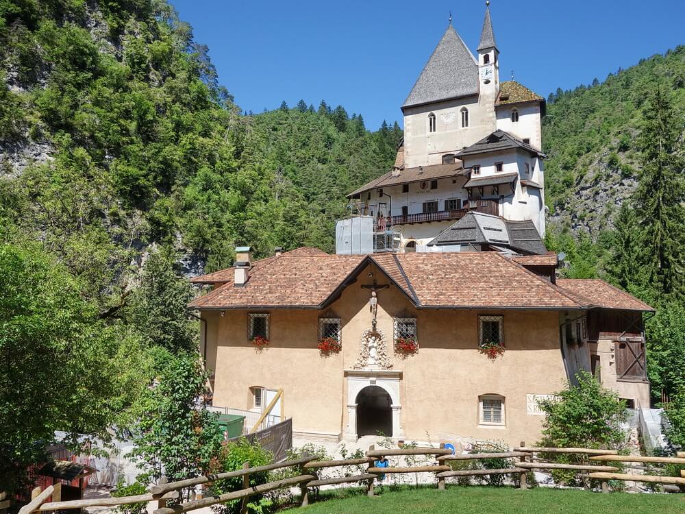Entspannt radeln wir weiter. Wir kennen die Strecke schon und freuen uns auf den Mix aus Schotterpiste und Trails bis zur Wallfahrtskirche San Romedio. Auf diese Strecke sind wir schon vor ein paar Jahren gestoßen, als wir aufs Geradewohl das Nonstal erkundet hatten. Uns war damals gleich klar, dass wir diese Passage in eine Transalp einbauen wollten. Der einzige Wermutstropfen ist, aus dem Nonstal mit dem Fahrrad wieder herauszukommen.