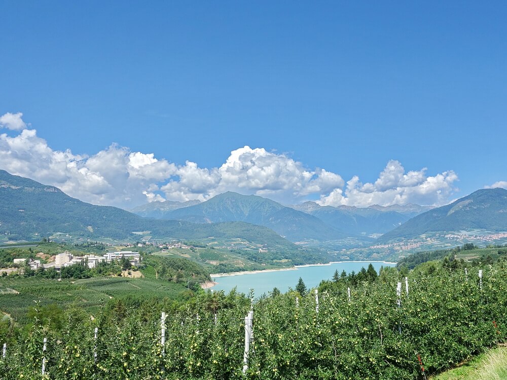 Will man vielbefahrene Straßen vermeiden, bleibt einem nichts anderes übrig, als von San Romedio aus die Schotterpiste nach Coredo zu fahren. Die geht zunächst stramm bergauf bis man die beiden Stauseen Lago di Tavon und Lago di Coredo erreicht. Von dort gibt es auf halber Bergeshöhe eine abwechslungsreiche Querverbindung in Richtung des Übergnags des Nonstals ins Etschtal.