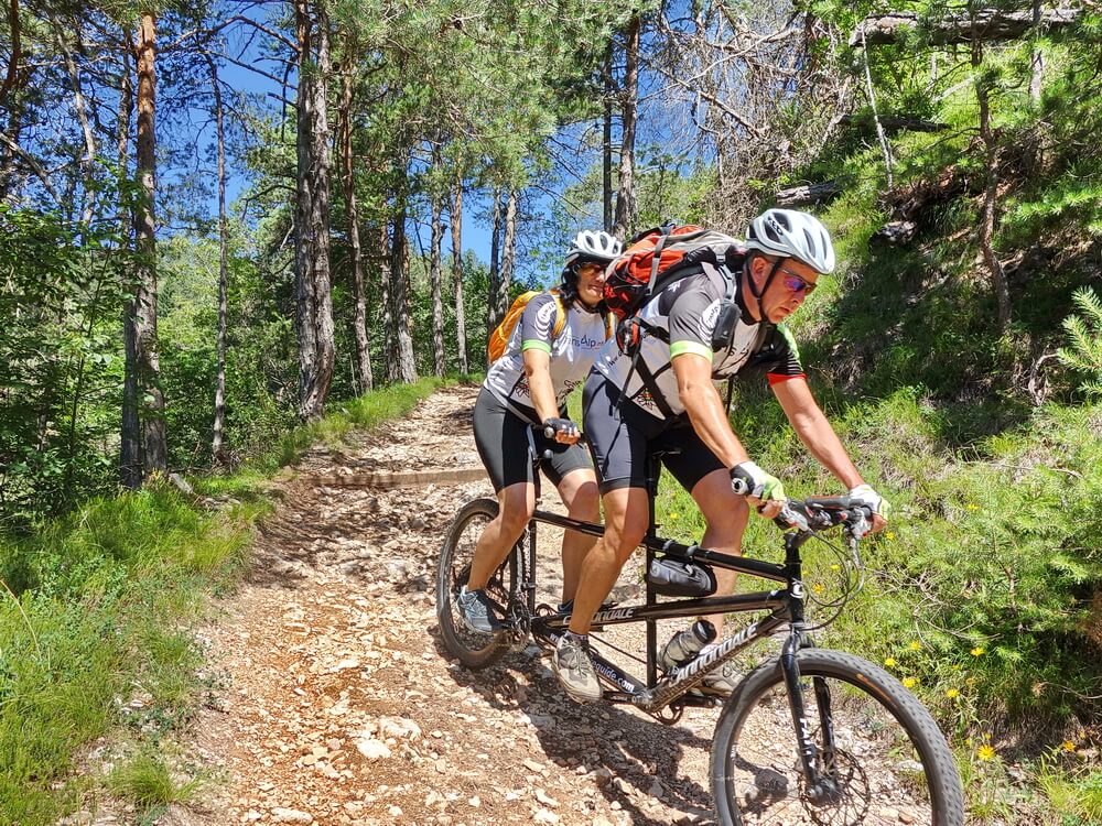 Die Etappe Meran-Trento könnte dieselbe sein wie bei der Sissi-Transalp. Doch danach steht uns nicht der Sinn, ein wenig Abwechslung soll schon sein. Bei einem Bikeurlaub hatten wir einen schönen Trail vom Mendelpass ins Nonstal entdeckt - den wollen wir in diese Transalp einbauen. Die Flachstrecke zwischen Meran und Frangart fährt sich am Morgen sehr angenehm. Der leichte Fahrtwind kühlt tatsächlich. Wärmer wird uns dann auf dem Radweg, der auf der alten Bahntrasse hinauf nach Kaltern verläuft. Bei St. Michael besteht die Chance, ein überraschendes Naturphänomen als Variante in die Route einzubauen. Es sind die Eislöcher - und sie tragen ihren Namen zu Recht. In einer Bodensenke am Fuß von Porphyrfelsen herrschen im Sommer wie auch im Winter die gleichen Temperaturen von ca. null bis neun Grad Celsius. Im Hochsommer ist es ein tolles Erlebnis, von einen Meter auf den anderen plötzlich eine Abkühlung zu erfahren, als ob man in einen Eiskeller geht. Wenn man diese Variante in die Strecke einbauen will, muss man in St. Michael abbiegen und ein etwas steileres Stück bergauf fahren. Entweder geht es auf gleichem Weg zurück zur Hauptroute oder man nimmt von den Eislöchern eine kurze Schiebe- und Tragepassage (ca. 30 Höhenmeter) zur Mendelpassstraße in Kauf. Von dort führt ein direkter Weg zur Talstation der Mendelbahn, die wir für unseren Aufstieg gern nutzen. Puristen meinen zwar, man müsste bei einer Transalp jeden Höhenmeter selbst gefahren sein; das ist uns aber völlig egal, zumal die Fahrt mit der Mendelbahn ein Erlebnis für sich ist. Unser Tandem geht geradeso hinein und flugs sind wir oben am Mendelpass.