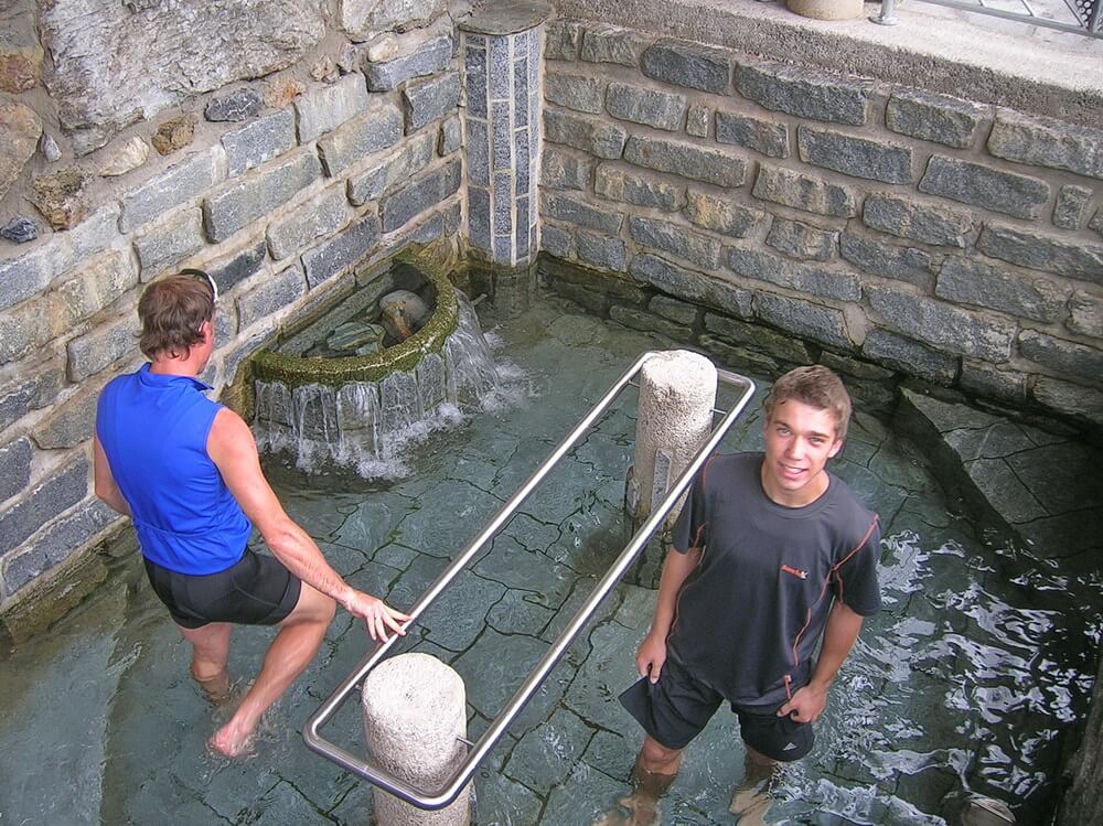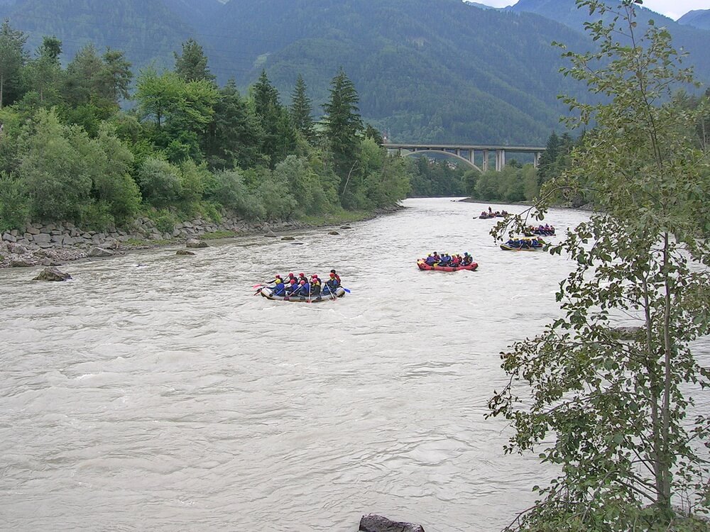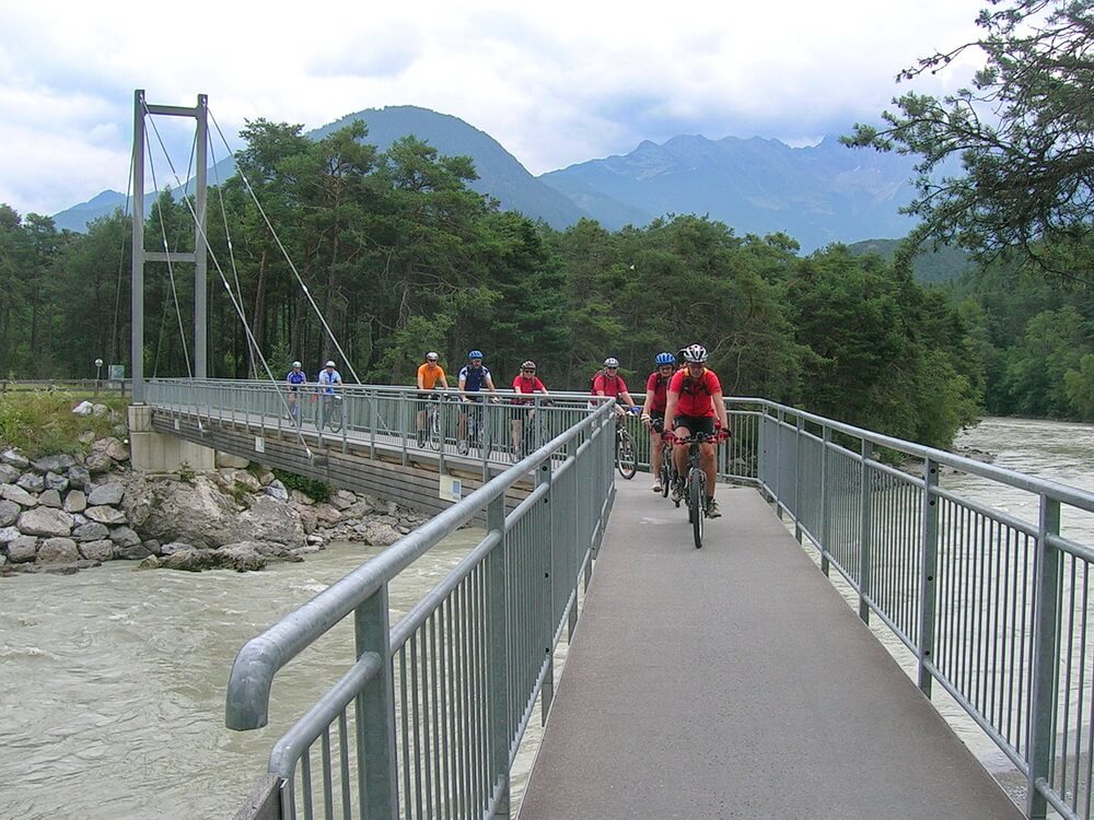 Schnell finden wir auf dem bestens ausgeschilderten Inn-Radweg unseren Rhythmus. Gemeinsam radelt es sich ohne längere Anstiege entspannt dahin. Wer will, nutzt den Windschatten des Vordermanns. Bald ist die erste Raststelle erreicht. Am Römerbadl kann man klares Quellwasser trinken und in der Kneipp-Anlage die Beine erfrischen. Gleichzeitig beobachten wir eine Vielzahl von Schlauchbooten, die zum Rafting auf dem Inn unterwegs sind. Wie der Zufall so spielt, fallen exakt vor unseren Augen ein paar Insassen aus dem Boot, was ein großes Gekreische zur Folge hat. Aber keine Panik, alle haben Schwimmwesten an. Der Rafting-Guide hat die Sache sofort im Griff und die nassen Hühner werden zurück ins Boot gehievt. Nach dieser Rast fahren wir ein paar Dutzend Meter zurück, um den Inn über den Innsteg zu überqueren.