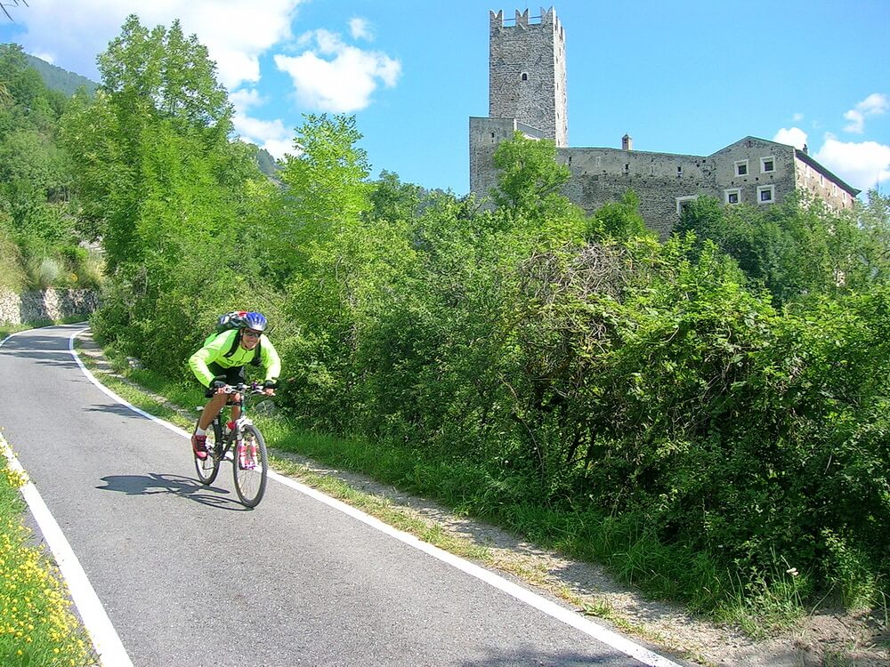 Wir folgen weiter dem gut beschilderten Vinschgau-Radweg. Steil geht es nach dem Haider-See auf schmaler Asphaltpiste hinab, an kleinen Weilern vorbei und durch malerische Dörfer. In Glurns machen wir Rast. Das kleine Städtchen konnte über die Jahrhunderte seinen mittelalterlichen Charakter komplett bewahren, verwinkelte Gässchen mit Laubengängen und als Krönung des Ganzen umschlossen von einer vollständig erhaltenen Stadtmauer. Mit dem Rad kann man sie in zehn Minuten einmal umfahren, wenn man sich dabei Zeit lässt.