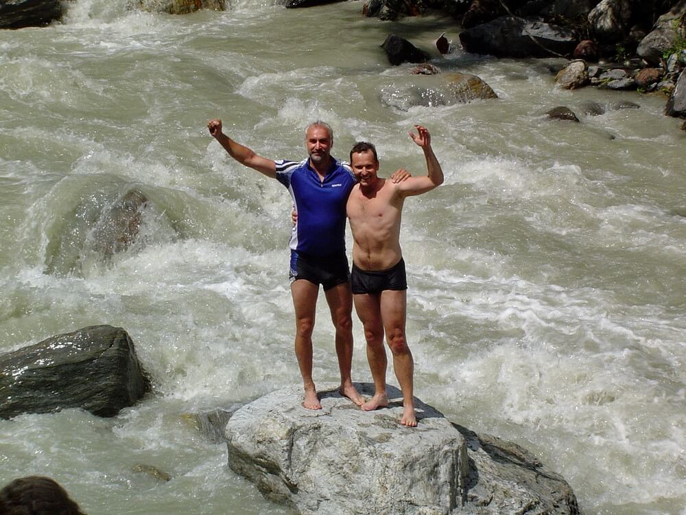 Nach der Pause ist entspanntes Rollen angesagt. Es geht fast nur noch bergab durch Apfel- und Weinplantagen, das weite Tal umrahmt von den umliegenden Dreitausendern. Bei Prad öffnet sich der Blick in Richtung Stilfser Joch. Bei der klaren Sicht ist das Gletscherskigebiet deutlich zu erkennen. In der Nähe von Schlanders führt der Radweg auf ein paar Kilometern durch eine kleine Schlucht. Im Schatten der Bäume lockt ein Rastplatz mit Wasserstelle und den hier häufig anzutreffenden Grillplätzen. Wir haben keine Eile, halten an, füllen unsere Wasservorräte auf und inspizieren die Umgebung. Über die Böschung hinunter kann man zum Fluss gelangen, der hier munter über große Steine gurgelt. Ein paar von uns klettern hinunter, balancieren zu den Steinen und lassen die Beine ins kühle Wasser baumeln – die Seele tut das Gleiche. Ralle albert mit dem Wasserschlauch herum; ein dicker Strahl ist das. Alke schmückt sich die Zehen mit Blümchen, die sie auf der Wiese pflückt. Schöner könnte es nicht sein.