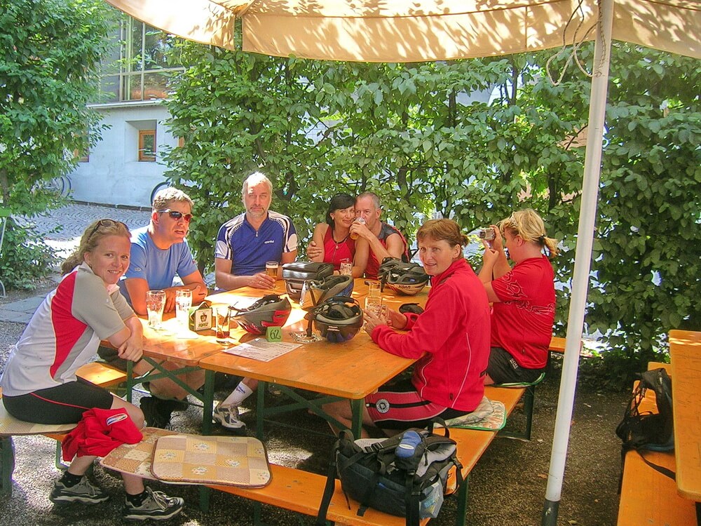 Wir rollen weiter an der Etsch entlang. Plötzlich weitet sich der Talgrund und Meran liegt zu unseren Füßen. Diesen Moment stillen Glücks sollte man genießen, später kann man ihn begießen. Der Biergarten der Forst-Brauerei kommt uns dazu gerade recht. Über eine schmale, überdachte Holzbrücke lässt er sich vom Radweg aus direkt erreichen. Im Schatten der uralten Bäume kosten wir alle Sorten Forst-Bier, die angeboten werden. Eine über 150-jährige Tradition weist die Brauerei auf, im Jahre 2007 war das Jubiläum. Schade, dass es das Bier bis jetzt nur in Südtirol und Italien zu kaufen gibt; es hätte sicher gute Chancen auf dem deutschen Biermarkt.