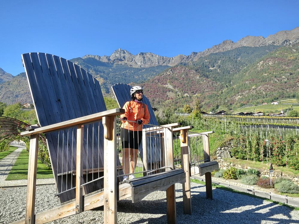 Am Morgen ist die Luft frisch und klar und der Himmel strahlend blau – so soll es sein. Die heutige Etappe habe ich bewusst kurz gehalten. Gut dreißig Kilometer sind es nur bis Meran. Jeder soll genug Zeit haben, um die wunderschöne Kurstadt an den Ufern der Passer oder ihre Umgebung zu erkunden. Alke und Ralle nutzen die Gelegenheit und fahren ein paar hundert Extrahöhenmeter. Ein Ausflug zur Burg Juval lockt. Zum weithin bekannten Domizil von Reinhold Messner kann man nicht mit dem Auto fahren. In vielen Serpentinen windet sich ein Privatsträßchen nach oben. Wir können die beiden vom Radweg aus gut beobachten. Zügig schrauben sie sich Kurve um Kurve nach oben, bis sie aus unserem Blickfeld entschwinden.