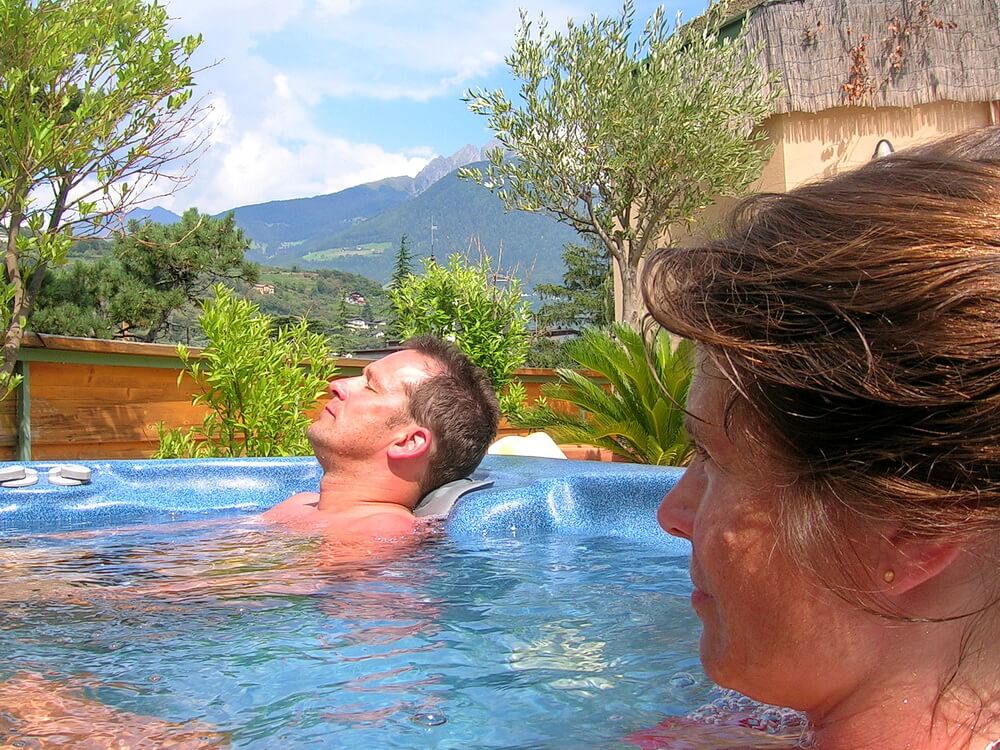 Durch unsere Pause gelingt es Alke und Ralle locker, noch vor uns im Hotel einzutreffen. Aber auch wir kommen zeitig an, gegen Mittag. Das Hotel „Flora“ ist ein Traum – direkt an der Passer gelegen ist die Innenstadt und die Kurpromenade zu Fuß in kürzester Zeit zu erreichen. Trotzdem liegt es ruhig im Schatten riesiger Laubbäume. Auf dem Dach ist ein Whirlpool, von dem aus man die umliegenden Berge im Blick hat. Im Garten gibt es einen Swimmingpool, die Abkühlung ist hochwillkommen. Röhli und Maren nutzen die Zeit für einen Radausflug in die umliegenden Berge. Sie nimmt das Fahrrad in der Seilbahn mit, er kämpft sich eine extreme Steigung in glühender Hitze hoch. Für andere ist Extrem-Shopping angesagt. In der Laubengasse und den umliegenden Straßen gibt es eine Vielzahl von Geschäften und Boutiquen. Sie bieten für jeden Geschmack und jeden Geldbeutel etwas an werden und zu jeder Jahreszeit gut vom internationalen Publikum frequentiert. Auf der Kurpromenade ist eine Bühne aufgebaut. Am Abend soll eine Band spielen. Der allabendliche Gewitterguss verhindert den geplanten Besuch. Unsere Ersatzparty findet im Saale statt.