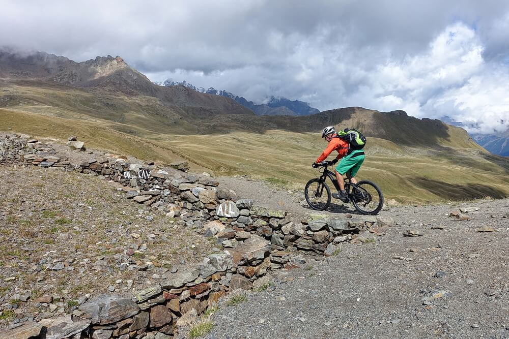 Die Fahrt in Richtung Sattelberg ist eine der Traumpassagen in den Alpen – ein grandioses Panorama umgibt uns. Über dem Olperer liegt eine Gewitterzelle, die den Bergen eine unheimliche Anmutung verleihen. Zum Glück ist sie offenbar lokal begrenzt. Wir vertun trotzdem keine Zeit mit langen Pausen, sondern fahren zügig durch bis zum Sattelberg. Hier beginnt die Abfahrt in Richtung Sattelalm auf der alten Militärpiste. In dieser Richtung ist sie komplett fahrbar und hat an einigen Stellen Trailcharakter, Philipp meint, dass sei ein Schottertrail. Das trifft es recht gut. Schließlich erreichen wir die Sattelbergalm. Die Gewitterwolken sind nicht bis hierher gezogen. Die Alm liegt so einladend in der Sonne, dass wir eine ausgedehnte Rast machen. Zeit, die Eindrücke der letzten Tage zu verarbeiten. Wir sind uns einig, dass diese Tour für uns beide ein Highlight darstellt. Die Eindrücke waren so intensiv und positiv, wie ich es kaum jemals auf einer anderen Transalp erlebt habe. Philipp bestätigt das. Er meint, dass dies wohl einerseits daran liegt, dass wir als harmonisches Zweierteam unterwegs gewesen sind, in dem in 6 Tourtagen keinerlei Missstimmung aufgekommen ist. Andererseits sind wir körperlich auch nie am Anschlag gewesen, was die sportliche Leistung nach unserem Empfinden trotzdem nicht schmälert. Man bleibt halt über weite Strecken im Wohlfühlbereich, zumindest, wenn man sich ansonsten mit ausgiebigen Trainingsfahrten auf diese Transalp vorbereitet, sei es mit normalen MTB oder eBike.