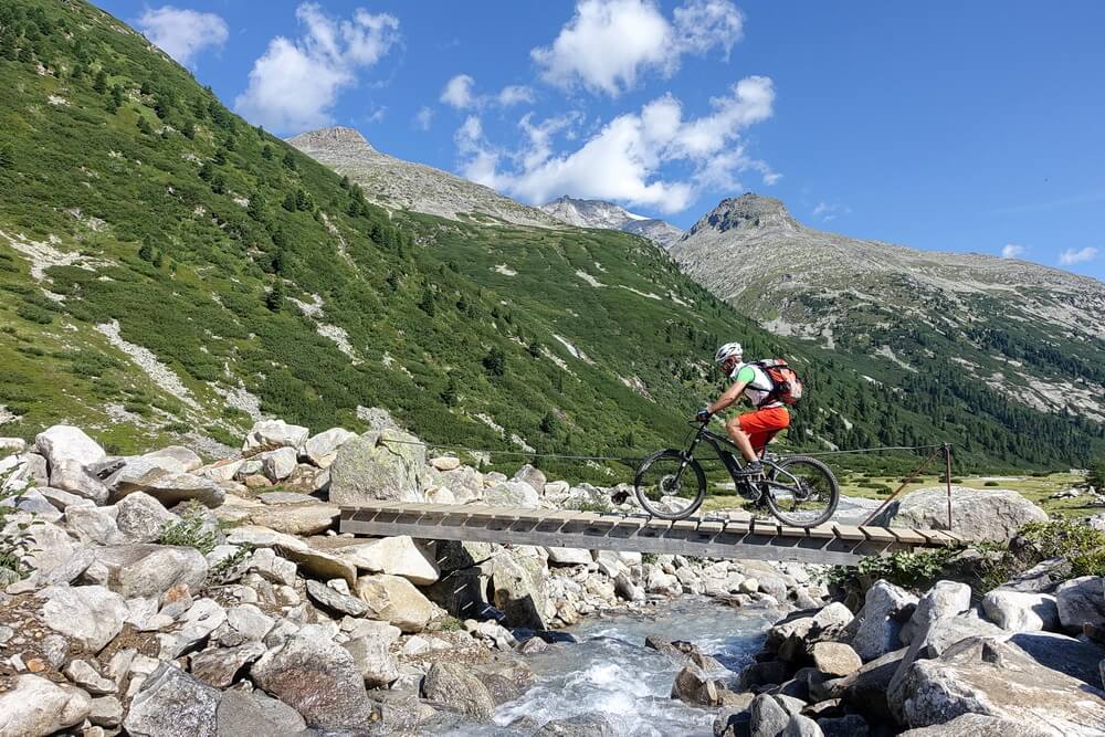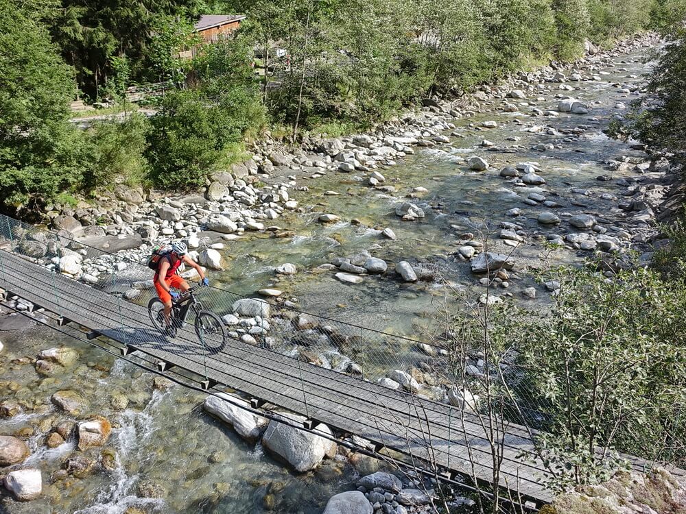 Wir drehen um und fahren über Brunnhaus nach Dornberg – nochmals ist ein Hauch von Trail dabei. Schließlich erreichen wir bei Jochberg die alte Schluchtstrecke in Richtung Schlegeisspeicher. Ein paar der Tunnels lassen sich außen umfahren und kurz vor Ginzling findet sich noch eine Hängebrücke, die uns früher als erwartet auf die alte Nebenstrecke bringt. Das ergibt eine gemütliche Fahrt bis zum Berggasthaus Breitlahner, welches auch eine gute Übernachtungsoption wäre.