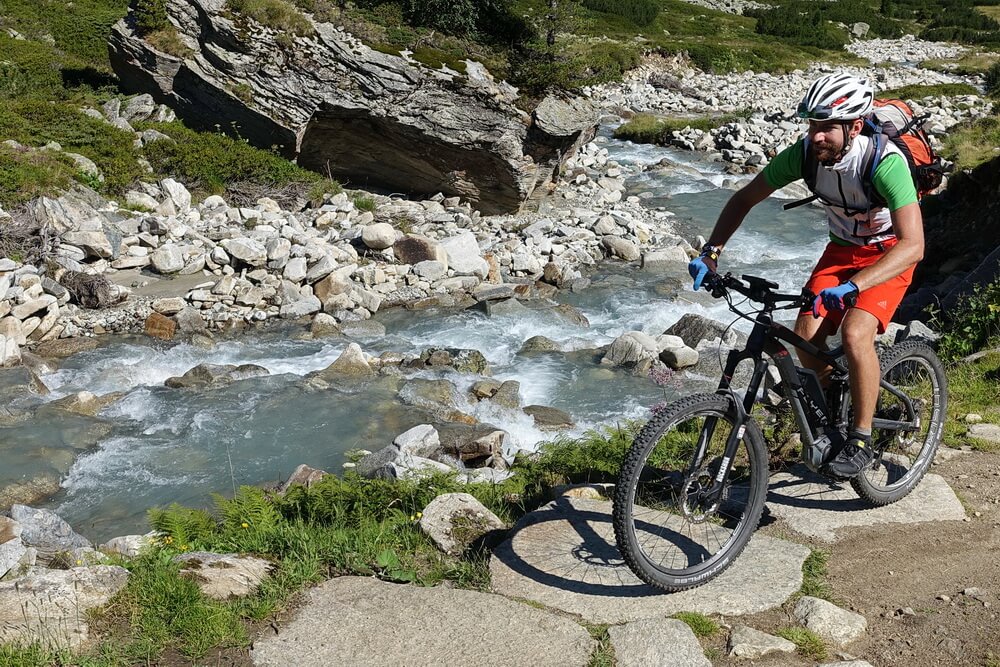 Doch wir liegen so gut in der Zeit, dass die fehlenden rund 1000 Höhenmeter bis zum Pfitscher Joch heute noch locker drin sind. Ich hatte Telefonnummern von verschiedenen Hotels im Pfitschtal mitgenommen und nutze eine lange Rast am Breitlahner, um eine Übernachtung klar zu machen. Das gelingt mir zu meiner Freude im Hotel Kranebitt bei Kematen, das auch mein heimlicher Favorit war. Also dann nicht mehr lange gefackelt, auf geht's. Das Pfitscherjoch ist der einzige etwas härtere Brocken auf dieser Transalp. Am Schlegeisspeicher beginnt der gut ausgebaute Wanderweg, der aber auch ein paar verblockte Stellen und einige Stufen aufweist. Das hatte ich im Vorfeld mit einem anderen eMTB getestet und zwar mit dem Vollcarbon-Bike „M1 Spitzing“. Da das meine erste größere Ausfahrt mit diesem Teil war, hatte ich etwas Vorsicht walten lassen und bin an den verblockten Stellen lieber zu früh als zu spät abgestiegen.