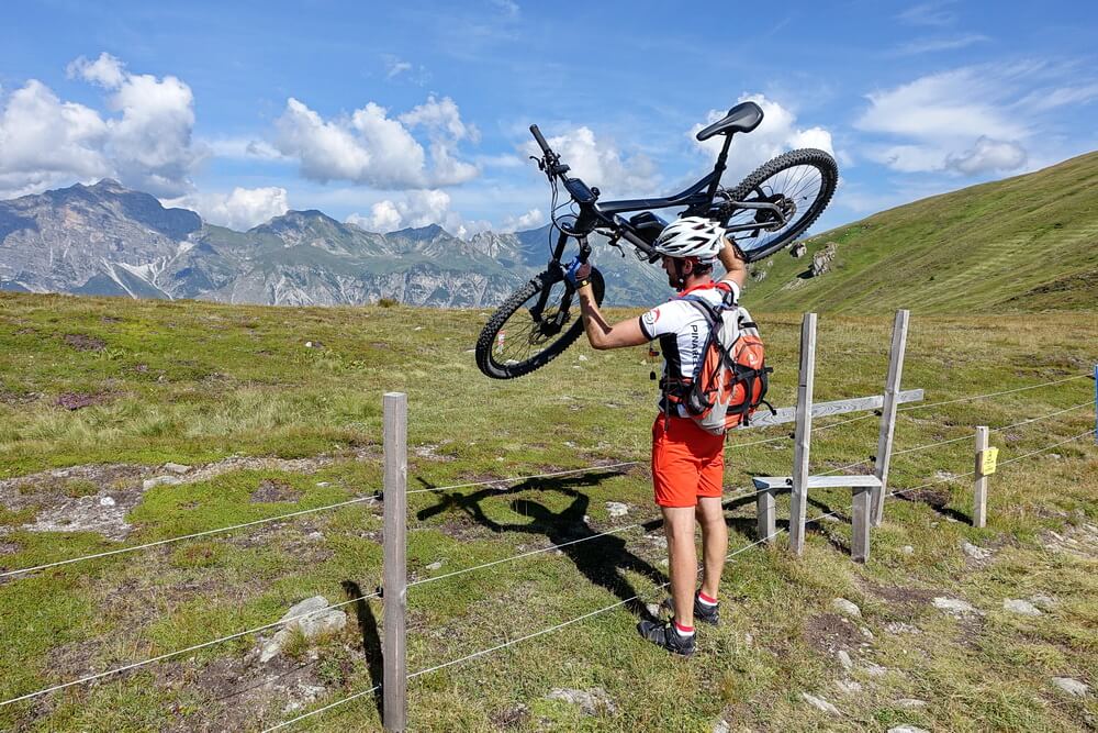 Gut 1000 Höhenmeter sind es hinauf zum Eggerjoch. Nach einer kurzen Passage hinein ins Obernberger Tal biegen wir in Vinaders auf die Nebenstrecke in Richtung Nößlach ab. An der Jakobskapelle beginnt dann der Almweg hinauf durch herrliche, lichte Lärchenwiesenwälder. Immer schön im Eco-Modus kurbeln wir bergauf, ab dem Paulerhof auf guter Schotterpiste. Die Gegend ist einsam, erst oben am Eggerjoch treffen wir eine einzelne Mountainbikerin, die aus dem Gschnitztal hinauf gefahren ist. Wir heben die schweren Bikes über das Weidegatter und machen uns an die Abfahrt. Ein leichter Wiesentrail geht nach einem knappen halben Kilometer in die Forstpiste in Richtung Trunahütte über.
