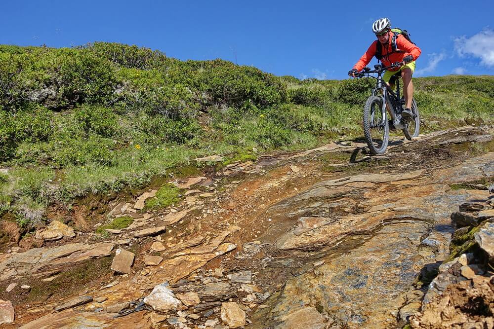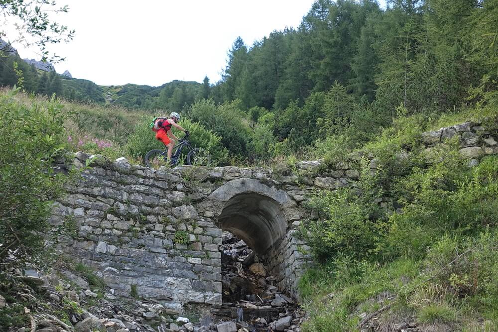 Die Abfahrt vom Schlüsseljoch in Richtung Brenner ist dann ein Highlight. Die ausgewaschene Piste hat ein paar schöne Trailabschnitte, in denen allerlei verblocktes Zeug herumliegt. Dabei kann das Uproc6 beweisen, dass es ein reinrassiges Mountainbike mit Enduro-Qualitäten ist.