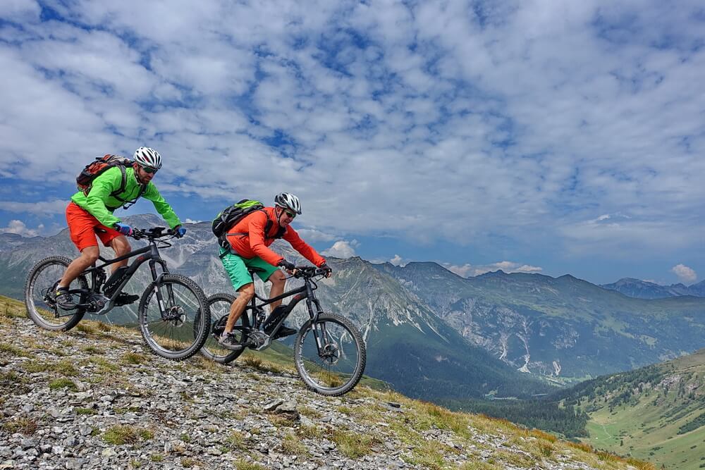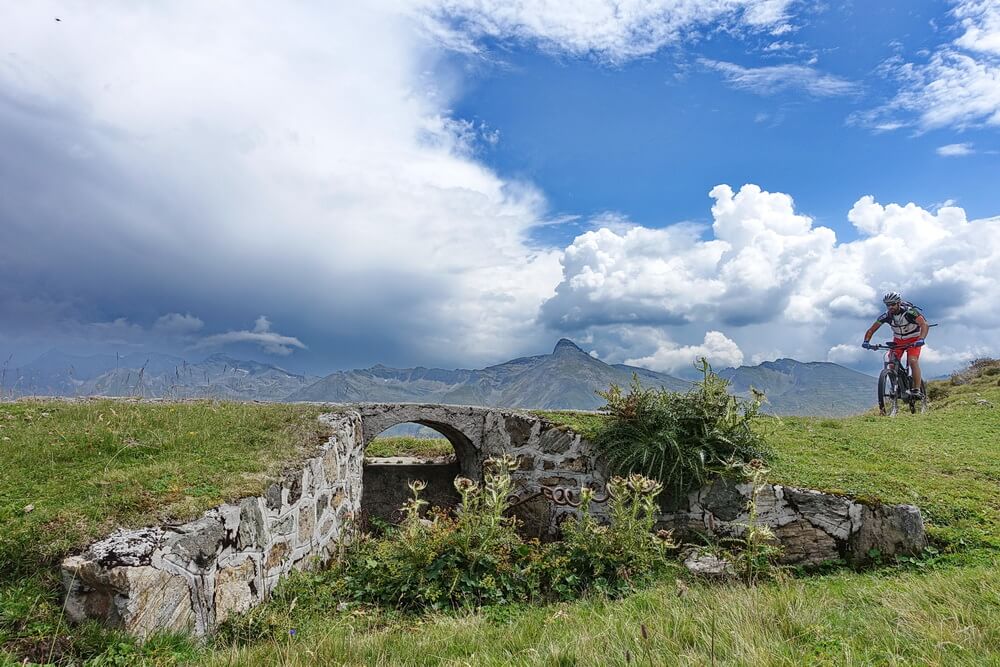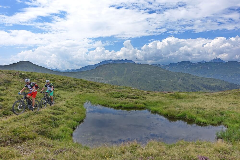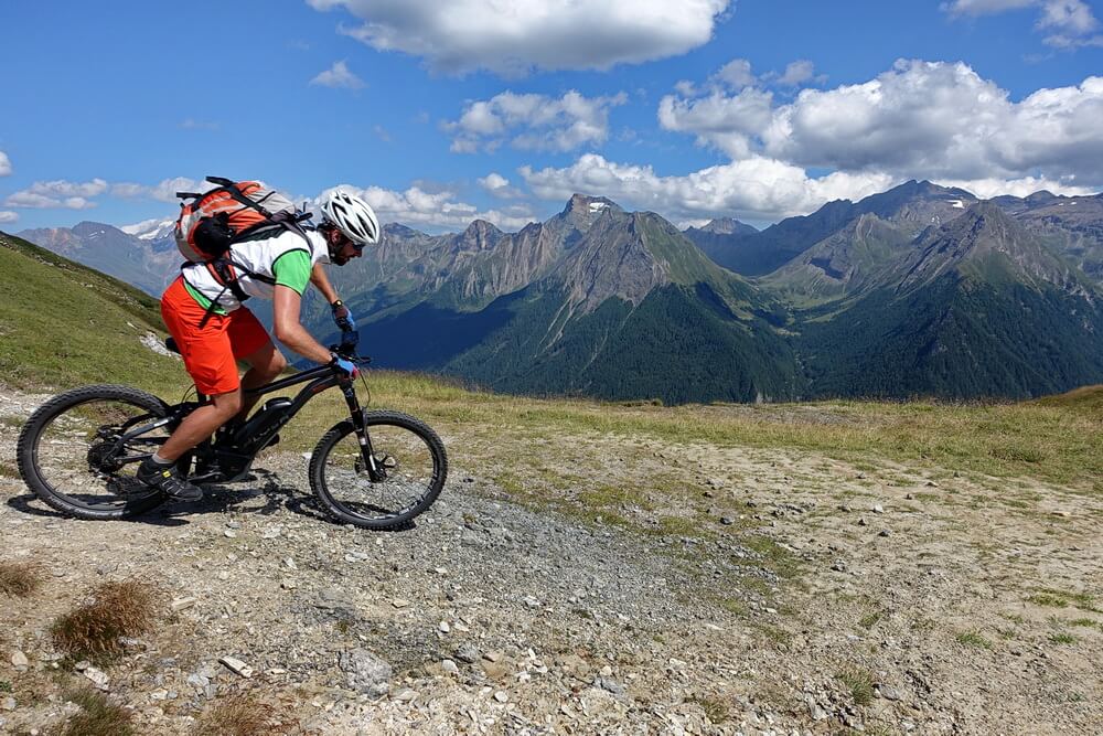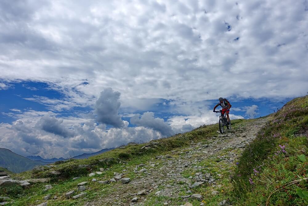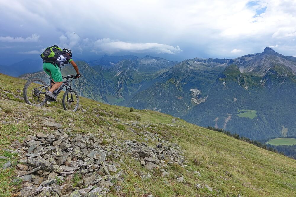 Die Fahrt in Richtung Sattelberg ist eine der Traumpassagen in den Alpen – ein grandioses Panorama umgibt uns. Über dem Olperer liegt eine Gewitterzelle, die den Bergen eine unheimliche Anmutung verleihen. Zum Glück ist sie offenbar lokal begrenzt. Wir vertun trotzdem keine Zeit mit langen Pausen, sondern fahren zügig durch bis zum Sattelberg. Hier beginnt die Abfahrt in Richtung Sattelalm auf der alten Militärpiste. In dieser Richtung ist sie komplett fahrbar und hat an einigen Stellen Trailcharakter, Philipp meint, dass sei ein Schottertrail. Das trifft es recht gut. Schließlich erreichen wir die Sattelbergalm. Die Gewitterwolken sind nicht bis hierher gezogen. Die Alm liegt so einladend in der Sonne, dass wir eine ausgedehnte Rast machen. Zeit, die Eindrücke der letzten Tage zu verarbeiten. Wir sind uns einig, dass diese Tour für uns beide ein Highlight darstellt. Die Eindrücke waren so intensiv und positiv, wie ich es kaum jemals auf einer anderen Transalp erlebt habe. Philipp bestätigt das. Er meint, dass dies wohl einerseits daran liegt, dass wir als harmonisches Zweierteam unterwegs gewesen sind, in dem in 6 Tourtagen keinerlei Missstimmung aufgekommen ist. Andererseits sind wir körperlich auch nie am Anschlag gewesen, was die sportliche Leistung nach unserem Empfinden trotzdem nicht schmälert. Man bleibt halt über weite Strecken im Wohlfühlbereich, zumindest, wenn man sich ansonsten mit ausgiebigen Trainingsfahrten auf diese Transalp vorbereitet, sei es mit normalen MTB oder eBike.