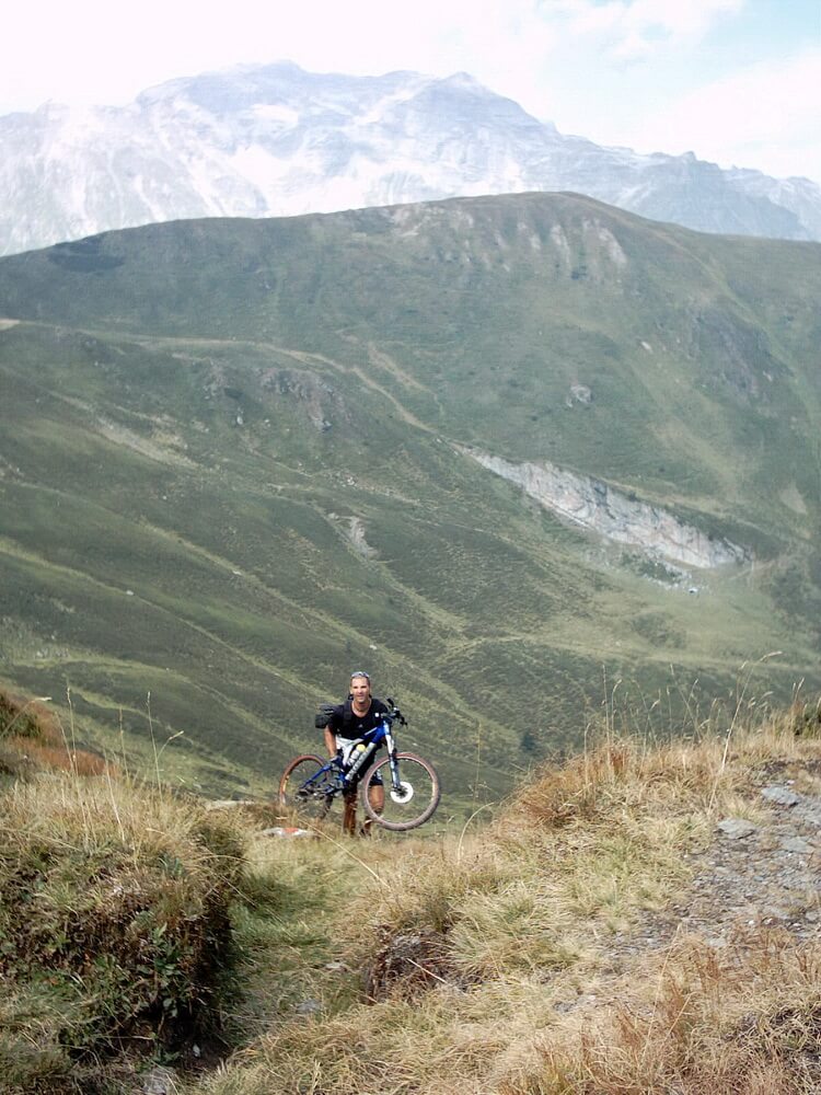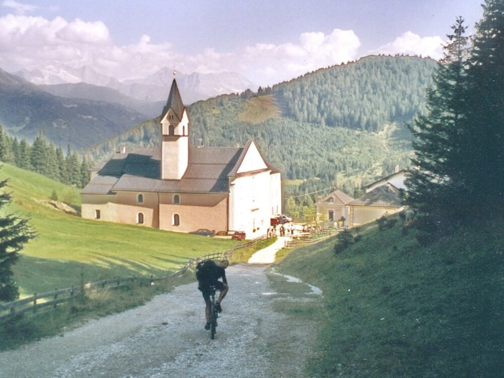 Startort war diesmal Mittenwald. Das Auto war schnell auf einem Dauerparkplatz abgestellt. Kurz nach 9 Uhr in der Früh saßen wir auf unseren Rädern. Die Wetteraussichten waren gut, fast schon ein wenig zu warm. Ich mag Hitze lieber als Kälte, für mich also sehr gute Bedingungen. Bis Seefeld radelten wir entspannt auf den reichhaltig vorhanden Schotterradwegen, die allesamt gut fahrbar sind. Im olympischen Seefeld war erstes Orientieren angesagt. Wir wollten den uralten Holzweg links von Mösern hinab ins Inntal fahren. Ihn zu finden war kein großes Problem. Tatsächlich erwischten wir auf der zwar steilen, aber ohne Probleme fahrbaren Abfahrt einen einheimischen Bauerntrecker, der Holz aufgeladen hatte. An einer passenden Stelle lies er uns mit einem freundlichen Gruß natürlich vorbei. Im Inn-Tal bei Oberpettnau angekommen umfing uns gleich die Hitze des Super-Sommers 2003. Also Wasser am Dorfbrunnen nachgetankt und weiter in Richtung Axamer Lizum. Robert Thätig hatte mich bei den Recherchen für diese Tour mit etlichen Varianten in Richtung Brenner versorgt. Vor Ort sieht man natürlich klarer. Die Straße hoch nach Axam hatten wir aufgrund des starken Autoverkehrs bald verlassen, um auf den zahlreichen Nebenwegen weiterzukommen: von Völs durch das Nasse Tal nach Birgitz und weiter Nebenwege nach Mutter. Wie der Zufall so spielt, trafen wir auf einen äußerst kompetenten Österreicher, mit dem wir die weitereren Wegalternativen besprechen konnten. Rasch wurde mir bestätigt, dass die schon von meinem geistigen Auge angepeilte Variante über Mutters-Kreith-Telfes-Maria Waldrast die sinnvollste für diese Transalp darstellte. Ich wollte soweit als möglich die Hauptverkehrsadern vor dem Brenner meiden, mir aber trotzdem nicht zu viele Höhenmeter aufladen. Von denen warteten ja noch genug auf uns.