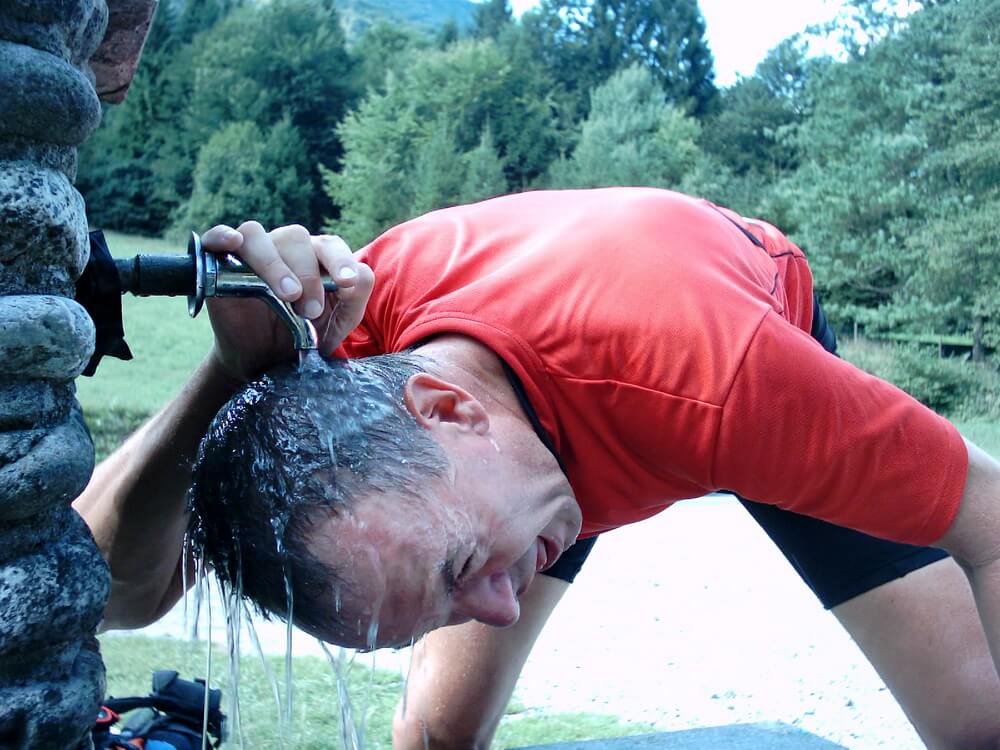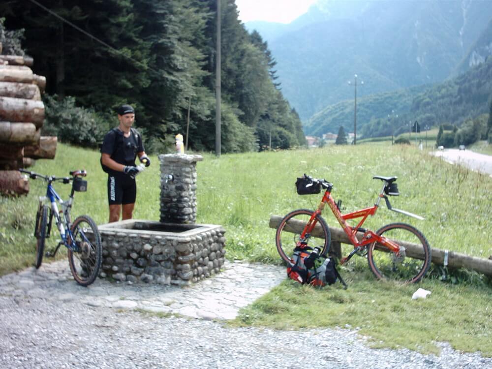 Unser Hauptaugenmerk war nun darauf gerichtet, schnell zur nächsten Malga mit Wasserstelle zu kommen. Das war nicht ganz einfach, da die Wege in der Kompass-Karte hier eher gemalt schienen als den exakten Verlauf darstellend. Wir verließen uns auf unseren Wege-Instinkt und fanden schließlich nach ein paar schweren Passagen auf und ab entlang des Bergkammes den richtigen Weg zur Malga Coredo. Ich schätze mal, es werden so an die 2 Liter Wasser gewesen sein, die wir dort ins uns hineinschütteten. Frisch gestärkt genossen wir dann die Abfahrt über Vervo, Prio und Mollaro hinab ins Tal des Flusses Noce. An der Staatsstraße angekommen bogen wir links ab und benutzten deren breiten Randstreifen als Radweg, um schnell bergab zu gelangen (das ist heute nicht mehr erlaubt). Man sollte hier keine Experimente eingehen und den Abzweig auf die Straße Richtung Spormaggiore nehmen. Denn ab hier wartet noch eine sehr schöne Schotterpiste, die über Le Seghe und Selvaplana nach Andalo führt. Die gut 500 Höhenmeter wollten aber auch erst mal bewältigt sein. Der Weg zieht sich und zieht sich und wird zum Ende hin immer steiler. Ab einem Fußballplatz kann man nun ein wenig bergab hinein nach Andalo. Im August ist hier alles mit italienischen Familien belegt, die ihren Urlaub mit Kind und Kegel genießen. Wir waren heute garantiert die einzigen Deutschen hier und fanden mit Mühe und Not eine nicht ganz billige, aber sehr ansprechende Unterkunft. Im Juli oder September sieht es da garantiert besser aus.