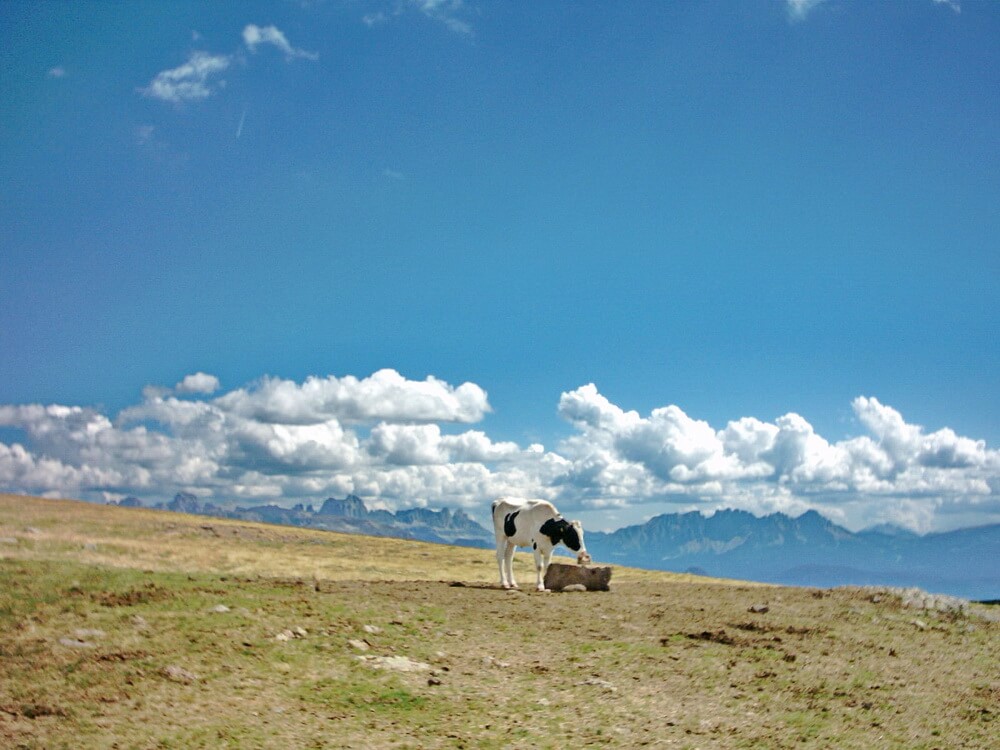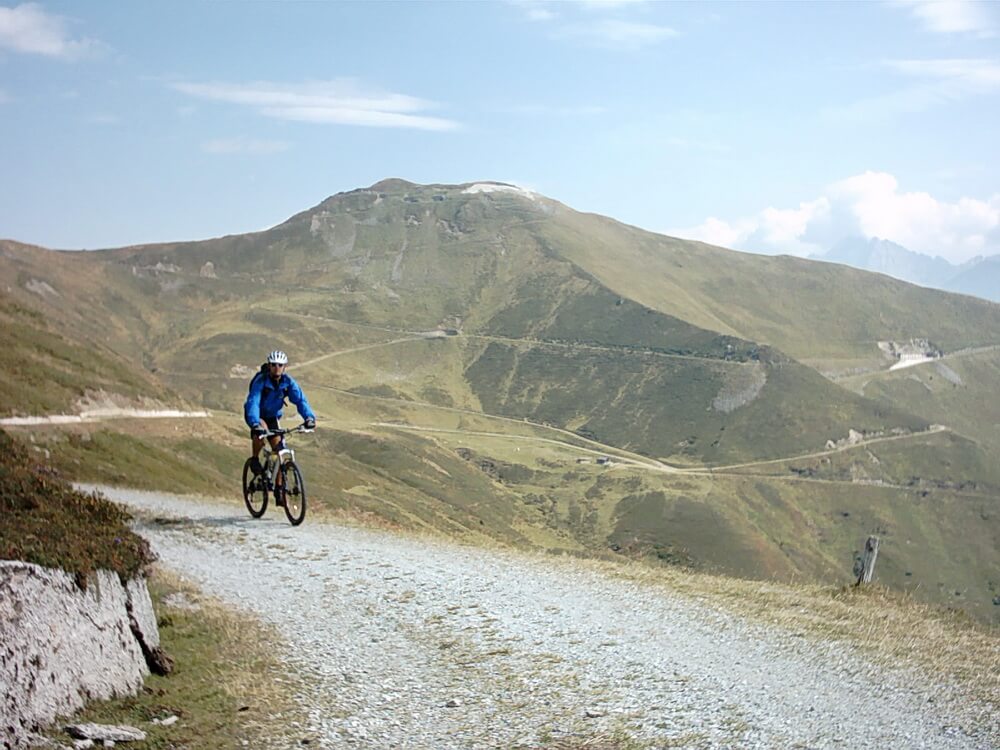 Frohgemut starteten wir an diesem strahlenden Sommermorgen zu einer Etappe, auf der wir reichlich 2800 Höhenmeter überwinden sollten. Das Grauner Joch und der italienische Urlaubsort Andalo in der Brenta waren die Eckpunkte. Das Joch mit einer Höhe von 1800 m hörte sich erst mal unspektakulär an. Der Start erfolgte aber bei rund 220 m. So wurde schnell klar, was uns bei dieser Hitze heute erwartete. Dieser Übergang ins italienische Sprachgebiet ist zwar durchgehend fahrbar, des Öfteren geht es allerdings in den Grenzbereich. Genug Wasser sollte man auf jeden Fall mitnehmen. Erst oben am Joch wussten wir nun, dass man in Graun bei ca. 900 m ordentlich Wasser für die Auffahrt bunkern sollte. Mit einer kleinen Ehrenrunde ab dem Wanderparkplatz, wo man sich geradeaus auf der guten Schotterpiste halten sollte, legten wir beide knapp 1000 Höhenmeter mit nur je einer Wasserflasche zurück. Als wir endlich oben angekommen waren, konnten wir gut nachvollziehen, wie sich ein Kamels in der Wüste fühlt, das am Verdursten ist.