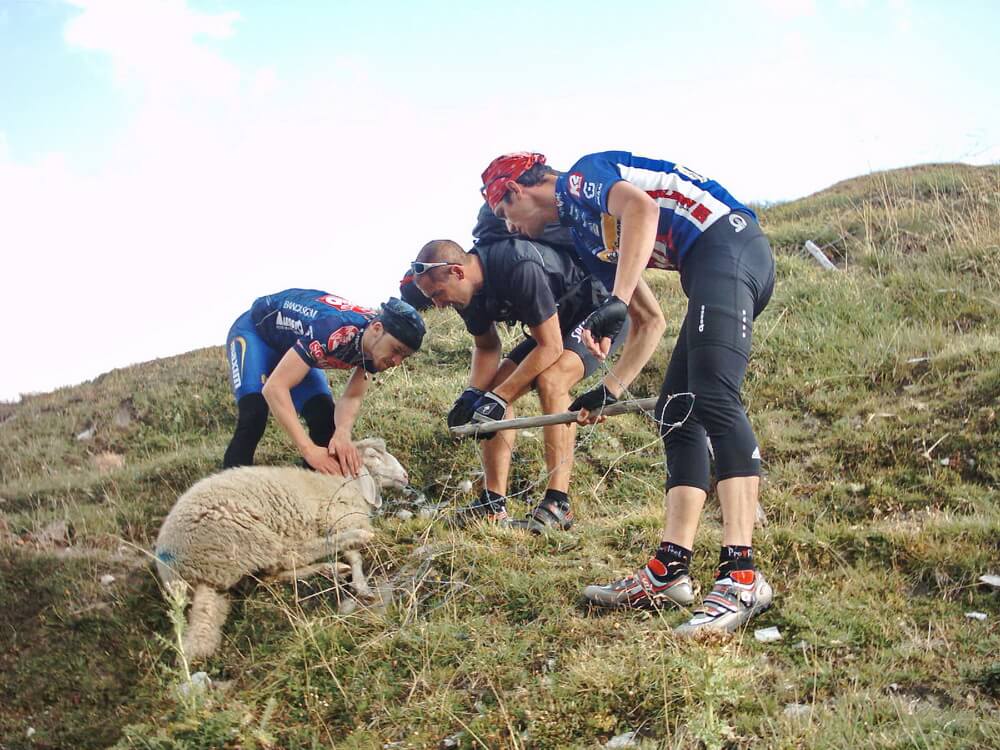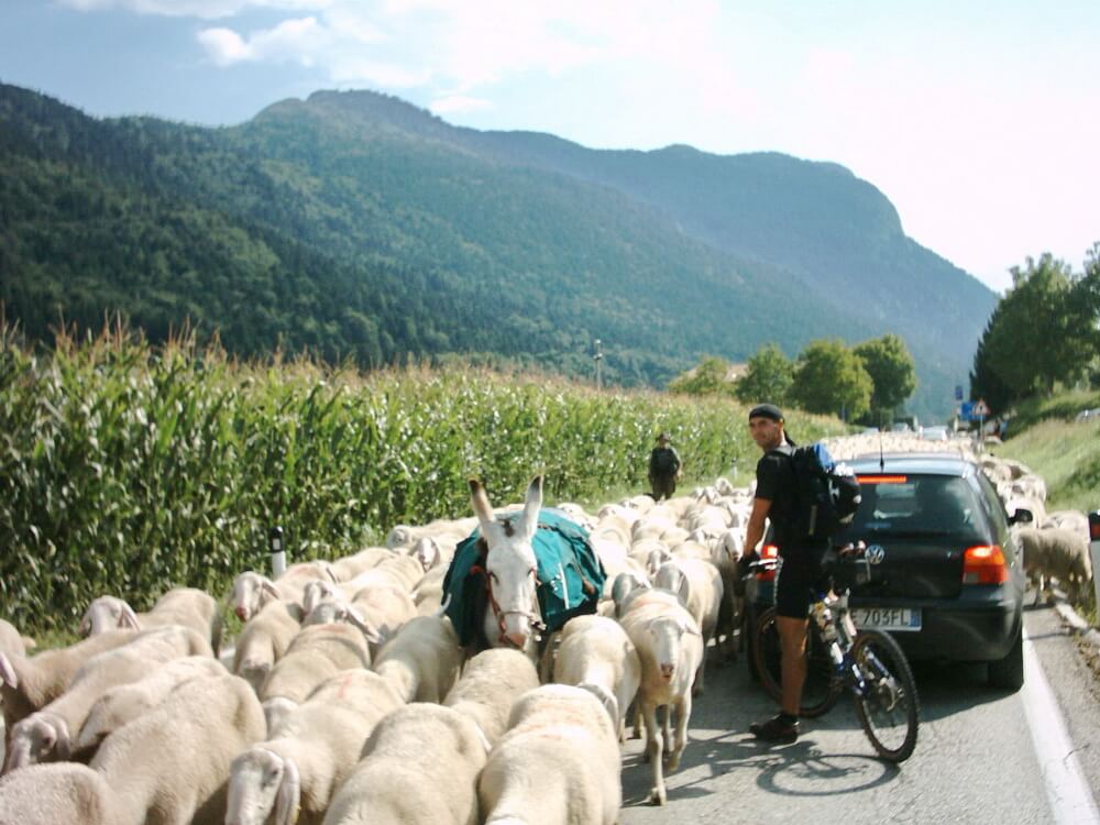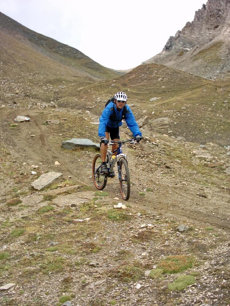 Die Auffahrt zum Schlüsseljoch (2209 m) war schnell erledigt. Ab und an musste wir schieben, weil der Weg zu ausgewaschen zum Fahren war. den Übergang als solchen erreicht man aber auf jeden Fall im Sattel sitzend. Gemeinsam mit zwei jungen Studenten auf ihrer ersten Transalp-Tour befreiten wir direkt am Joch ein Schaf, das sich im Stacheldraht verfangen hatte und sonst wohl dem Verdursten geweiht gewesen wäre. Das glückliche Geschöpf gab seiner Freude Ausdruck, in dem es eine ganze Weile bergab unseren Weg begleitete, bis es seine Herde erreicht hatte. Bei einem kurzen Foto-Stopp schien sich dann das Oberhaupt der Herde auch noch bei uns bedanken zu wollen. Es kam zu uns heran, beschnüffelte uns kurz, aber intensiv und trollte sich dann mit einem freundlichen Nicken von dannen. Leider hat sich diese gute Tat auf unsere kurzzeitigen Wegbegleiter nicht positiv ausgewirkt. Eigentlich wollten wir zusammen zum Pfunderer Joch fahren. Einer unserer kurzzeitigen Begleiter hatte bei der schweren Schotterabfahrt, die ca. 800 hm hinab nach Fussendrass führt, mit seinem schlauchlosen System-Rad einen Platten: Wie wir später von einer nachkommenden Gruppe erfuhren, mussten sie wegen der Reparatur nach Sterzing abfahren. Soviel zum Thema High-tech auf Transalp-Tour. Wir warteten also in Fussendrass vergebens und machten uns nach einer Weile allein auf den folgenden Uphill über ca. 1200 hm. Vorher füllten wir unsere Wasservorräte bei Einheimischen auf, die gerade beim Verlassen ihres Gehöftes waren. Sie gaben uns auch den Hinweis, wo noch Wasserstellen zu finden waren. Das Pfunderer Joch befindet sich im touristischen Niemandsland und ist auch deshalb einer der beeindruckendsten Übergange des Alpenhauptkammes, die mit dem Mountainbike machbar sind. Wir trafen unterwegs nur auf einem einsamen Hirten. Die Auffahrt ist zu weiten Teilen extrem steil, ohne Flachstücke und an der Grenze des Fahrbaren. Das eine oder andere Schiebestück lässt sich je nach Kondition sicher nicht vermeiden. In 2,5 - 3 Stunden sollte man aber oben sein.