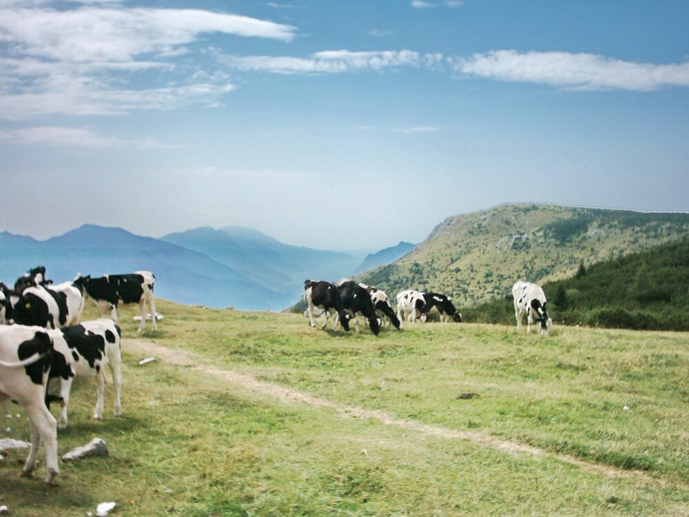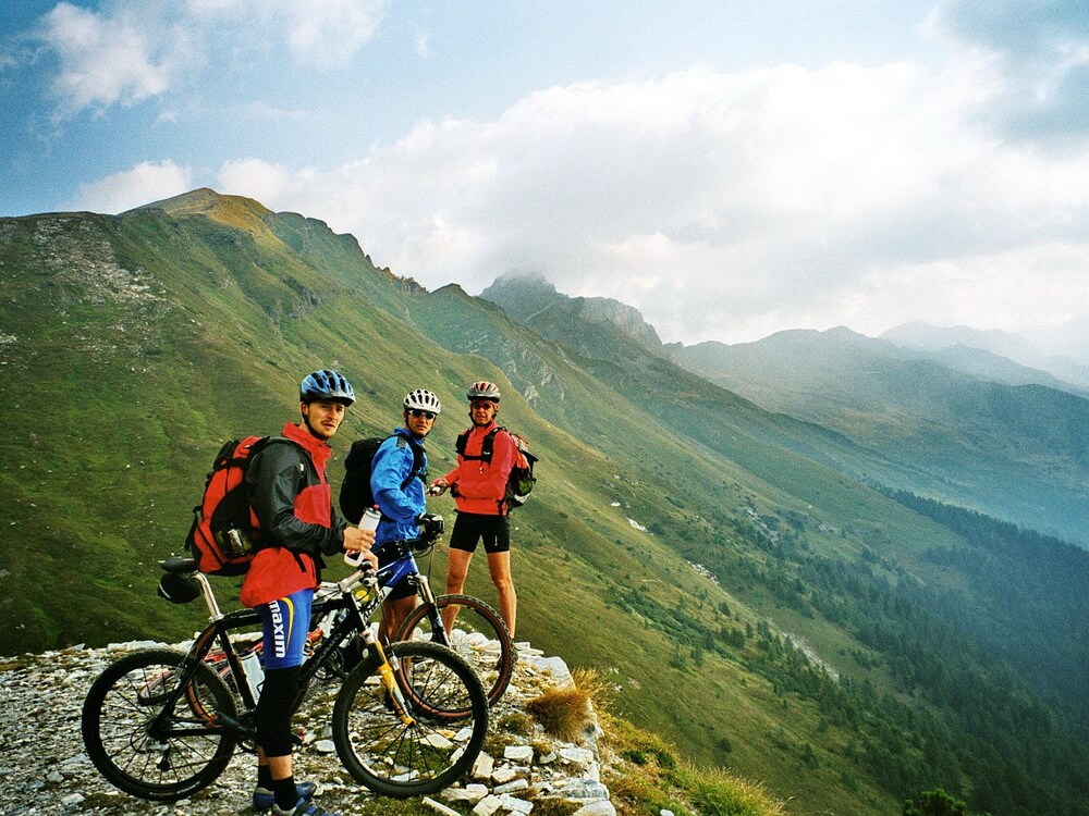 Voll Tatendrang machten wir uns am Morgen auf den Weg. Der Himmel war wolkenverhangen, es sah nach Regen aus. Die Route sollte entlang des Monte Gazza führen, den Gardasee in Greifweite nah. Bei der Tourplanung im Vorfeld hatten mich der schon erwähnte Robert Thätig und Elmar Neßler (www.faszination-alpen.de ausführlich beraten (nochmals meinen Dank und Grüße von dieser Stelle an beide). So ganz einfach war es trotzdem nicht, den richtigen Weg im Skigebiet zu finden. Einsetzender Nieselregen war auch nicht gerade dazu angetan, viel Zeit mit der Wegsuche zu verbringen. Also doch auf die Skipiste und ein wenig die Räder geschoben. Es hörte bald auf langsam zu regnen. Zum Glück war gerade eine Liftstation in der Nähe, wo wir uns zumindest im Trockenen unterstellen konnten. Im Laufe der einstündigen Pause zogen wir uns nach und nach dickere Sachen an, da es auch ungemütlich kühl wurde. Ein seltenes Gefühl in diesem Sommer 2003. Nur die Ruhe konnte es bringen. Schließlich wurde es wieder heller. Es tröpfelte nur noch ein bisschen und wir zogen weiter. Am Berg war man fleißig mit Pisten- und Wegebau beschäftigt, so dass wir uns wieder auf unsere mittlerweile stark ausgeprägten Instinkte für den richtigen Weg verließen und Richtung Malga di Covelo erst marschierten und später wieder fuhren. Die Wege waren gerade frisch verbreitert, noch recht grob und schlecht zu fahren. Beim nächsten Mal wird es besser gehen.