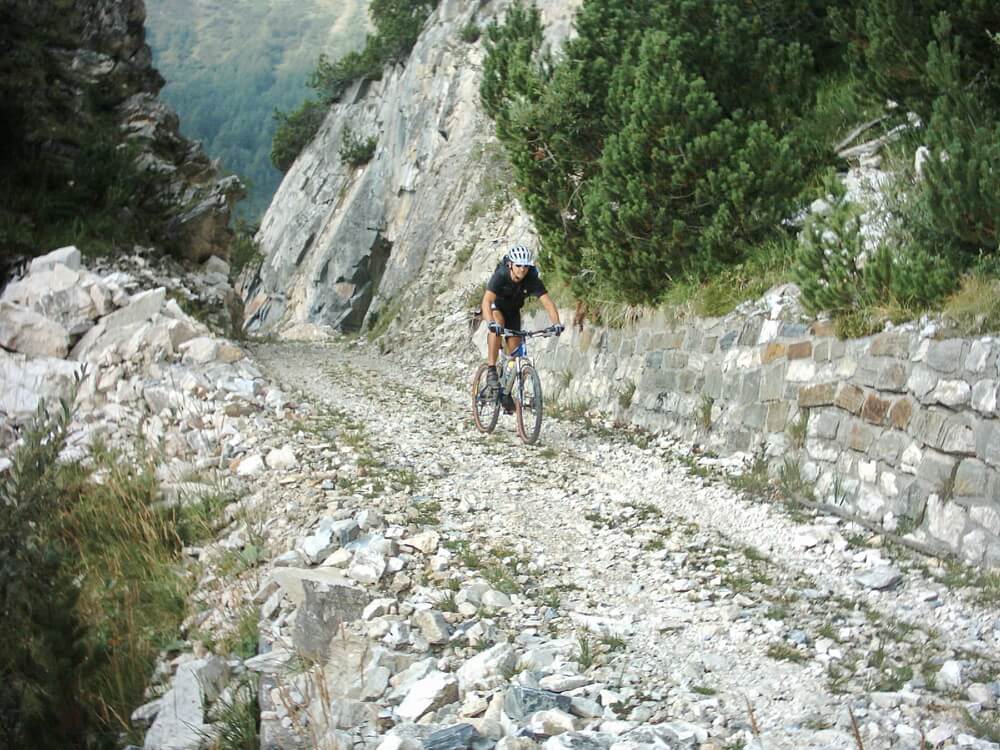 Nach dem Erreichen des offenen Almgeländes begann dann die immer steiler werdende grobe Abfahrt zur Malga Gazza. Den berühmten Stein mit der Wegweisung nach Margone sollte man bei dieser Transalp buchstäblich links liegen lassen und gerade auf dem breiten Schotterweg bleiben. Dieser Pfad führt nur unsäglich steil und mit Rucksack kaum fahrbar die Bergflanke hinab.