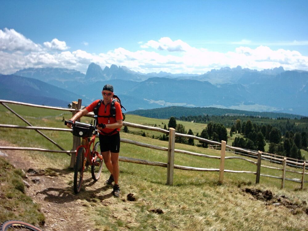 Diese Transalp ist geprägt von großen Höhendifferenzen, die pro Tag am Stück zurückgelegt werden müssen, Gebirgs-Hopping sozusagen. Die gestrige Reparaturpause hatte ich nutzen können, um die Auffahrt in die Sarntaler Alpen zu verifizieren. Der einheimische Mountainbiker Norbert Hoffmann gab mir den wertvollen Insider-Tipp, durchs malerische Thinnebach-Tal hinauf zu fahren (herzlichen Dank von dieser Stelle aus). Ab Klausen (sehr gut erhaltenes mittelalterliches Stadtbild) bewältigten wir gut 1500 Höhenmeter am Stück bis zur Rast an der Stöffl-Hütte. Im oberen Teil waren die Kompass-Karten nicht unbedingt eine große Hilfe, so dass wir eine kleine Ehrenrunde Richtung Latzfons drehten. Dies war nicht zwingend notwendig war, bescherte uns aber ein paar zusätzliche Höhenmeter. Der nette junge Mann, der eigentlich Holz spalten wollte, war schwer beschäftigt mit Auskünften betreffs des richtigen Weges. Es dauerte eine kleine Weile, bis auch wir dran waren und unsere Fragen los wurden. Also, immer schön Richtung Stöffl-Hütte/Kasereck fahren. Schließlich erwischten wir den richtigen Abzweig und schraubten uns weiter Meter um Meter in die Höhe. Ab einem Parkplatz für Wanderer begann die Schotterstrecke. An einer Weggablung sagten uns die Wegweiser, dass beide Wege zur Stöffl-Hütte führen würden. Wir entschieden uns für den linken, da er zu Beginn weniger steil erschien. Nach Erreichen des Plateaus eröffnete sich uns ein atemberaubendes Panorama. Die Dolomiten mit Sella, Schlern und Rosengarten, die Berge der Texelgruppe, Adamello-Brenta und des Ortler-Gebietes. Alles in voller Pracht zu sehen. Die Insellage der Sarntaler Alpen macht diesen überwältigenden Rundum-Balkonblick über einen riesigen Bogen des Alpenraumes möglich. Viel beeindruckender als auf der berühmteren Seiseralm. An der Stöffl-Hütte war dann der logische Rastpunkt. Hier sahen wir auch den eben erwähnten zweiten Weg ankommen. Wahrscheinlich wäre dieser komplett fahrbar gewesen. Auf unserer Route konnten wir auf einen verblocktem Wiesentrail ein paar Meter unserer Wandererlust frönen. Den grandiosen Panoramablick genossen wir auf der Terrasse der Stöffl-Hütte. Dabei führten wir uns dringend notwendige Kalorien zu. Weiter ging es auf guten Schotterwegen oberhalb der Baumgrenze Richtung Rittner Horn, nicht ohne ein paar Höhenmeter bei der Abfahrt zu Hütte Moar in Plum zu verlieren, die wir via Gasteiner Sattel wieder gewinnen mussten. Dass wir nach Bozen hinunter wollten war klar, wie jedoch genau, musste sich noch ergeben.