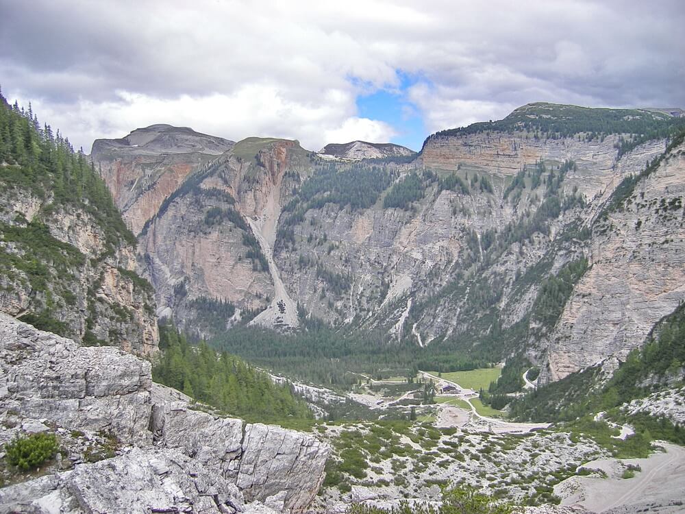 Der Blick aus dem Fenster zeigt uns ein zweigeteiltes Wetterbild. Am Alpenhauptkamm dichte Wolken und milchige Regenschauer. Hier blauer Himmel mit Wolkenfeldern, aber für einen Sommeranfang deutlich zu kühl. Das ist uns egal, weil uns Speck-Oswald vom Nebenhof als "Wetterexperte" verspricht: "Heute bleibt es schön, nur der Wind wird auffrischen!" Wir glauben es gerne und ziehen die Beinlinge an. Eine schöne kleine Straße bringt uns zum Grund des Gadertals, das wir bei Zwischenwasser erreichen. Schnell sind wir in St. Vigil, wo ich vergeblich versuche, einen neuen Schlauch zu kaufen. Macht nichts - dann eben im nächsten Ort mit besserer Logistik. Nun beginnt die lange, zunächst leichte Anfahrt zur Fanes. Über einige Kilometer zieht sie sich hin. Wir wechseln von der Teerstraße auf den parallel verlaufenden Schotterweg und später wieder zurück. An der Pederühütte beginnt der "ernste" Teil des Aufstiegs. Die steile Schotterpiste versorgt die beiden Hütten auf der Hochalm der Fanes. Die Faneshütte liegt direkt an unserem Weg, die Lavarellahütte im hinteren Teil der Hochebene. Wenn man die Etappenplanung so gestaltet, dass man hier eine Hüttenübernachtung einlegen möchte, empfiehlt sich in der Hauptsaison eine Reservierung. Auf jeden Fall gehören diese beiden Hütten zu jenen, wo ich auch übernachten würde, wenn es sich bei der Tour so ergibt.
