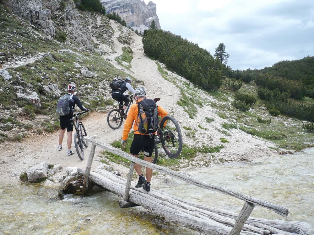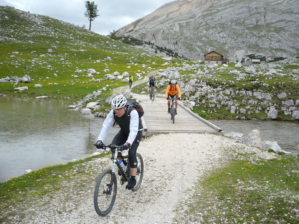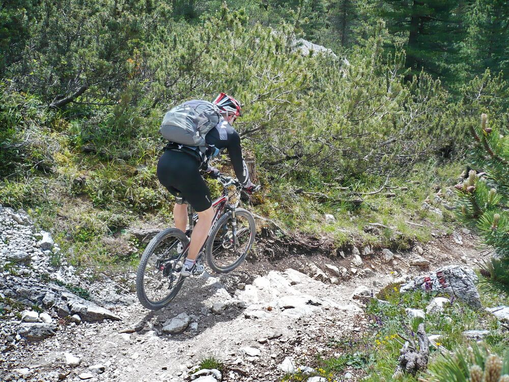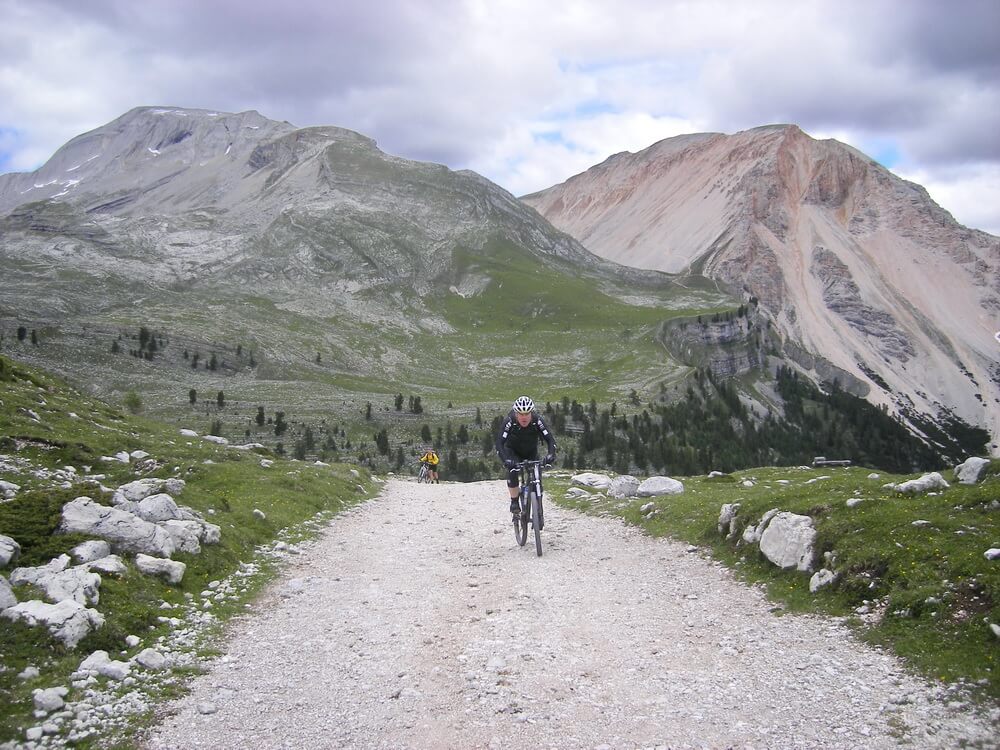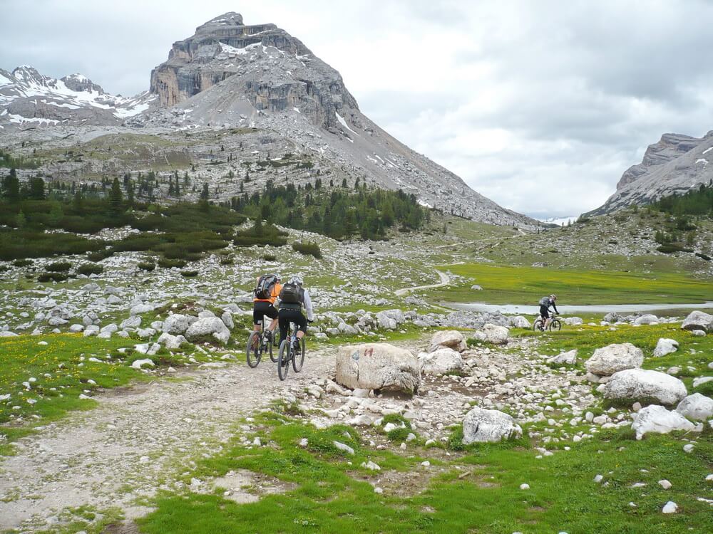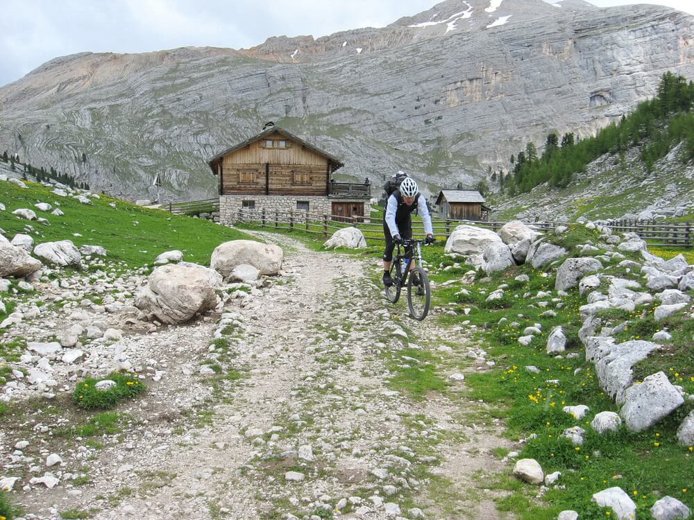 Wenn man nach Cortina d'Ampezzo will, kann man die Fanes komplett fahrenderweise durchqueren. Wir biegen jedoch bei der Hütte an der Großen Fanesalm rechts ab in Richtung St. Kassian. Der Almweg lässt sich bis zum Col de Locia flüssig fahren. Dann beginnt ein Trailabschnitt, der ein paar knifflige Passagen aufweist. Gute Fahrtechniker werden an den verblockten Stellen ihre Freude haben. Wir steigen lieber einmal mehr als zu wenig ab, um keinen Sturz zu riskieren. Bald können wir wieder fahren, der eine früher, der andere später.