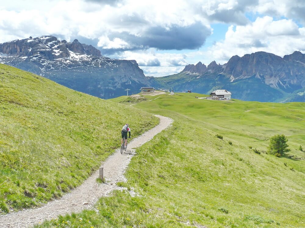 An der Capanna Alpina wechseln wir nach links auf den Wanderpfad, der uns ins Tal führt. Nun folgt die Auffahrt zur Pralongia. Die Pralongia an sich ist ein eher unspektakulärer Berg. Allerdings umringt von den Highlights der Dolomiten: Marmolada, Sella und, und, und. Der Ausdruck gigantisch hat hier einen kleinen Beigeschmack von Untertreibung. Langsam schrauben wir uns auf einer guten Schotterpiste nach oben. Die bösen Rampen kommen erst zum Schluss, also Kräfte gut einteilen. Schließlich sind wir oben auf dem Kammweg, der uns zum Gasthaus Pralongià bringt. Der Wind hat sich zum Sturm gemausert und fällt uns heftig an. Er zerrt an den Rucksäcken, fährt in die Speichen. Das Wort Windjacke bekommt eine völlig neue Bedeutung. Zum Glück ist der Weg nicht ausgesetzt. Wir steuern vorsichtig die Hütte an und verziehen uns ins Innere. Das einzige Mal auf dieser Tour treffen wir hier eine andere Transalpgruppe. Sie wollen hier übernachten. Uns ist es noch zu früh. Wir fahren nach Corvara ab. Der heftige Wind drückt uns ein paar Mal von der Schotterpiste auf die Wiese. Am Golfplatz wartet zum Abschluss noch ein kleiner Trail auf uns, der uns fast bis zu den ersten Häusern von Corvara führt. Eine Unterkunft finden wir schnell. Im ersten Anlauf landen wir wieder einen Volltreffer - die gemütliche Pension Raetia. Sie hat zwar "nur" zwei Sterne, die Innenausstattung hat allerdings 4-Sterne-Niveau. Wir reiben uns die Augen und fragen die Wirtsleute, wie das zusammenhängt. Sie sagen, dass sie auf die Anzahl der Sterne keinen Wert legen und dass es steuerlich eher günstiger ist, auf einen Stern zu verzichten. Wichtiger sei es, dass die Gäste zufrieden sind und Mundpropaganda machen. Das übernehmen wir in diesem Falle gern. Es herrscht eine sehr angenehme familiäre Atmosphäre. Die Freundlichkeit und Hilfsbereitschaft kommt von Herzen und ist nicht antrainiert. Hierher kommt man gerne ein zweites Mal zurück.
