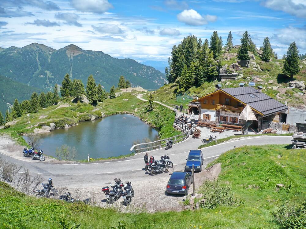 Die Folgen der abendlichen Darbietung zeigen sich in einem stark verzögerten Auftauchen der nun wieder seriös wirkenden Dame, die uns schließlich die recht moderaten Rechnungen präsentiert. Ein Zuschlag für die künstlerische Leistung wird nicht erhoben. Die Regenwolken haben sich verzogen. Ich flachse noch mit Stephan herum und sage, dass wir heute das Val Sugana erreichen werden, das für seine sommerliche Hitze berühmt-berüchtigt ist. Er verzieht keine Miene und zieht sich kommentarlos seine Beinlinge an. Die Auffahrt zum Manghenpass ist eine reine Fleißaufgabe. Die kleine Nebenstraße wird kaum befahren. An der Ponte delle Stue geht es moderat los, zum Schluss warten ein paar kleinere Rampen - Spaß muss sein. Kurz vor dem Pass befindet sich die Manghenhütte, willkommener Sammelpunkt und Raststation. Es ist zwar noch nicht Mittag, wir essen aber trotzdem jetzt schon eine Kleinigkeit, denn am Nachmittag wartet noch eine Auffahrt auf uns. Am gemütlichen Rifugio versammeln sich auch die auf der Straße unvermeidlichen Motorradfahrer. Kommunikation zwischen Mountainbikern und den potentiellen Organspendern findet nach meiner Beobachtung so gut wie nie statt. Uns fällt nur auf, dass recht viele mit verkniffenem Antlitz herumsitzen, wahrscheinlich wegen der immensen Anstrengungen beim Absteigen und Platznehmen.
