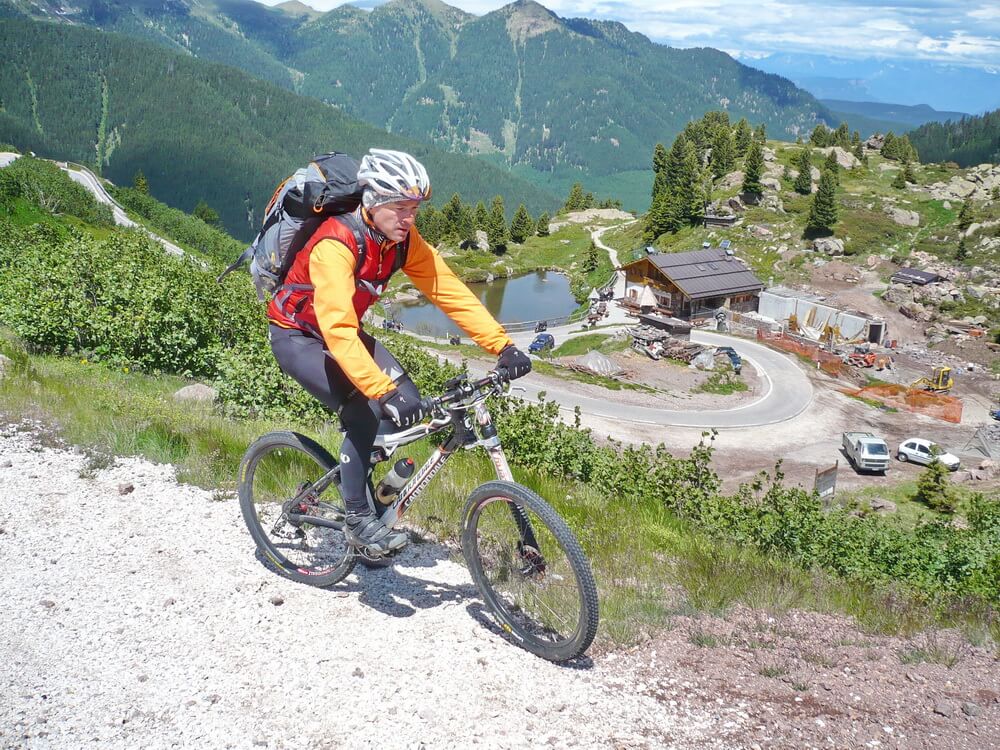 Kurz nach dem höchsten Punkt am Spiazzo Alto zweigt rechts ein Teilstück der MTB-Strecke "100 km dei Forti" ab. Wer Rast machen will, kann hier ein paar Höhenmeter bergab rollen bis zum Albergo Monterovere. Hier hatte ich schon einmal auf einer Transalp übernachtet, ein zweites Mal muss das nicht sein. Meine Begleiter sind auch nicht vom spröden Charme dieser Herberge angetan. Außerdem müssen wir schon noch ein paar Höhenmeter auf Schotter zurücklegen, sonst könnte man diese Etappe auch mit dem Citybike zurücklegen, grinst Dirk und rollt zurück zum Spiazzo Alto. Ein paar Höhenmeter sind es noch auf der alten Militärpiste. Schließlich rollen wir hinein nach Bertoldi, das einladend in der abendlichen Sonne liegt. Es ist siebzehn Uhr. Wir schauen uns die paar Hotels an und entscheiden uns übereinstimmend für das am gemütlichsten wirkende Hotel Caminetto. Wieder ein Volltreffer - geräumige, saubere Zimmer, himmlische Ruhe und als Krönung des Ganzen ein fünfgängiges feines Menü. Bis jetzt könnte die Tour auch Transalp de Gourmet heißen.