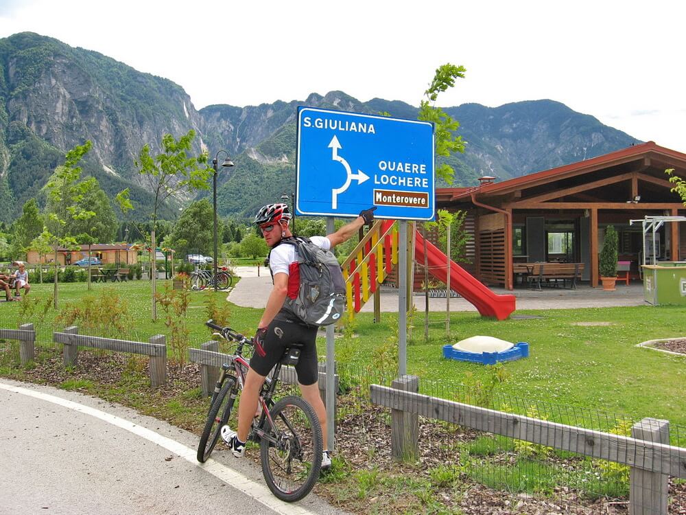 Die Abfahrt ins Val Sugana findet mangels sinnvoller Alternativen auch auf der kleinen Nebenstraße statt. Für uns sind Schotterpisten nicht die allein seligmachende Heilslehre, deshalb genießen wir das entspannte Rollen entsprechend. Bei ca. 700 Meter Höhe wollen wir uns zusammenfinden, weil wir dort über die Fortsetzung der Route beratschlagen wollen. Stephan ist der erste am Sammelpunkt und schon fleißig beim Umziehen. Es ist ihm nun doch sehr warm geworden im Val Sugana. Gleichzeitig ist sein Stimmungsbarometer auf freundliche Werte gestiegen. Ein bisschen auf Schotter wollen wir heute dann doch noch fahren. Bei Telve findet sich ein kleines Stück
