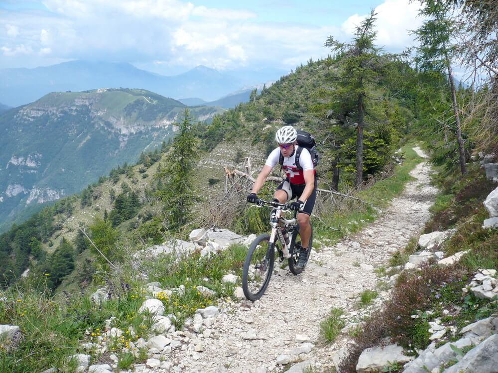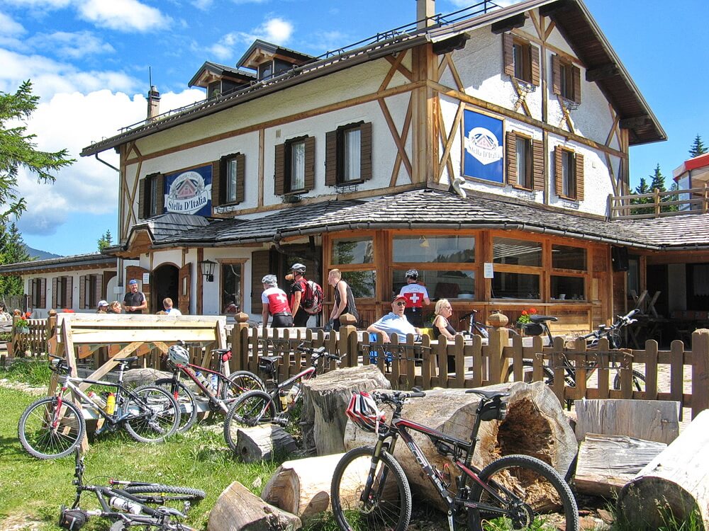 Doch so weit sind wir noch nicht. Erst einmal wartet der nächste Pass auf uns, den Passo Sommo. Den erreichen wir leicht auf der Straße, die von Carbonare bergauf führt. Eine kurze Rast, dann aber wieder ab ins Gelände. Die Auffahrt zum Rifugio Stella d'Italia lässt sich angenehm fahren, dann wieder eine kurze Rast auf der Sonnenterrasse der Hütte. Wir treffen wieder auf die Transalpler, die auf der Pralongià übernachtet haben. Für sie ist heute ihre Transalp quasi beendet. Sie wollen nach einer ausgiebigen Rast nach Rovereto abfahren und dann kurz und schmerzlos den Gardasee erreichen. Wir haben noch mehr vor und machen uns auf den Weg. Wir passieren das Forte Sommo. Wer will, macht dort einen Abstecher zu dieser alten Festungsanlage. Wir schenken uns das heute, da noch ein paar Höhenmeter vor uns liegen und überqueren schließlich nach einer kurzen Abfahrt die Straße, die zum Passo Coe führt. Nun beginnt der alte Militärpfad zum Monte Maggio. Moderat beginnt es, zum Schluss wird es immer knackiger und wilder. Der Pfad verfällt zunehmend und wird verblockt. Wer das komplett fahren kann - Hut ab.