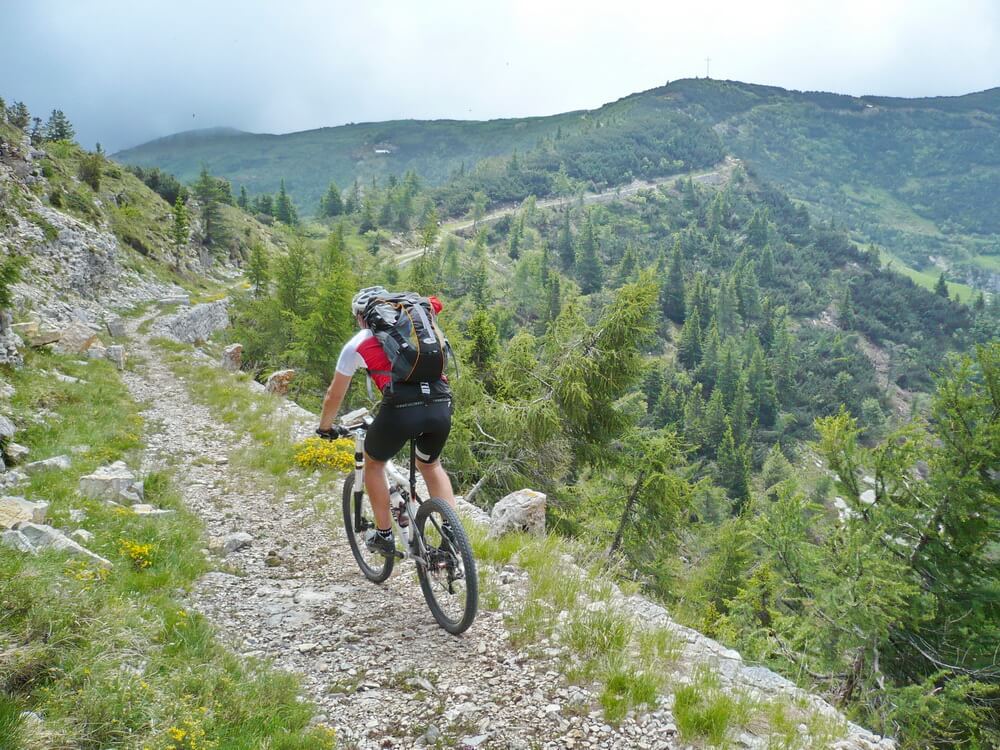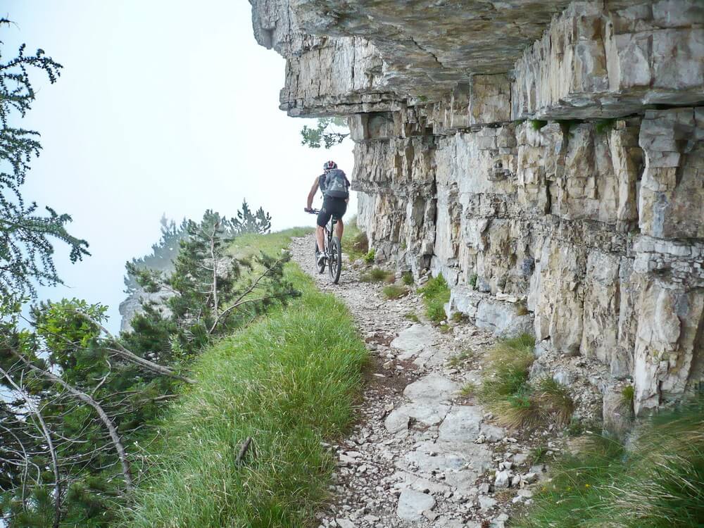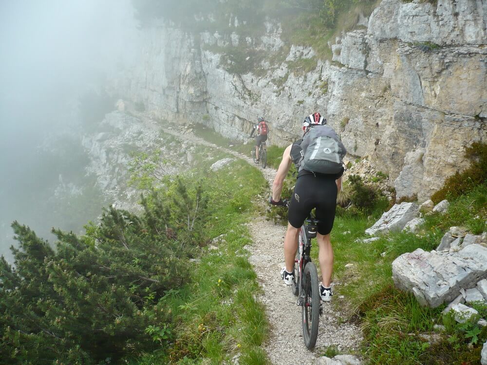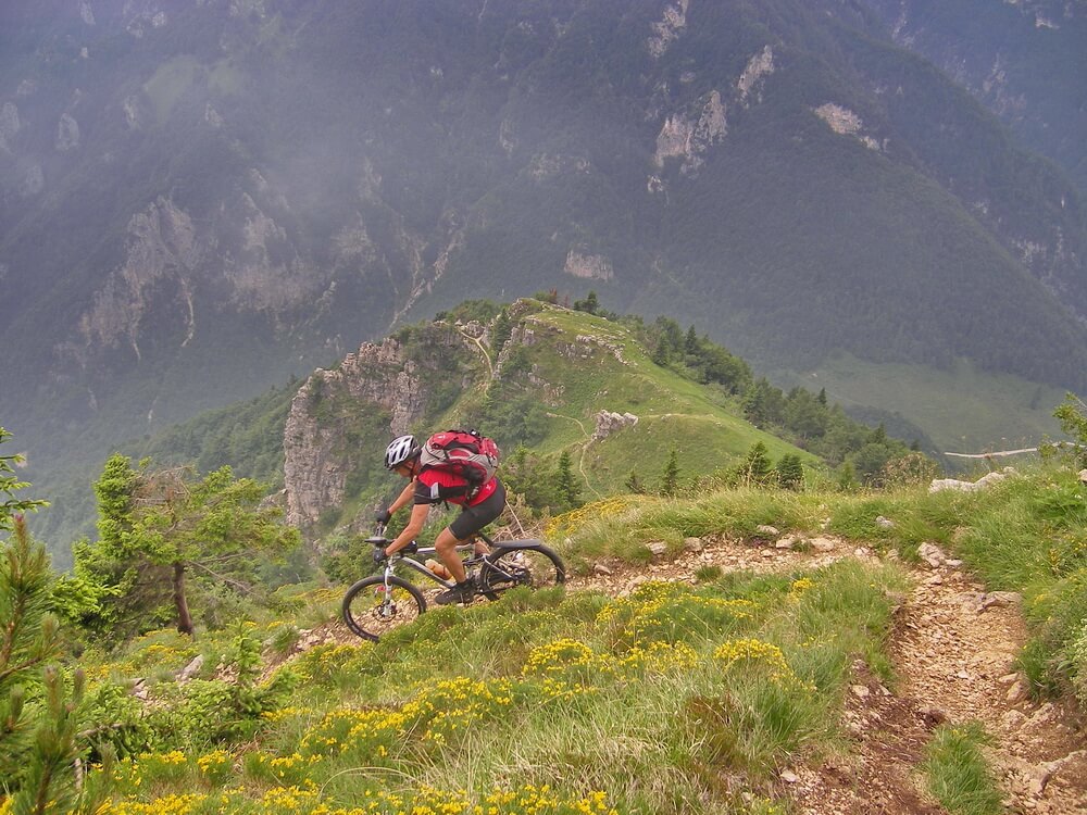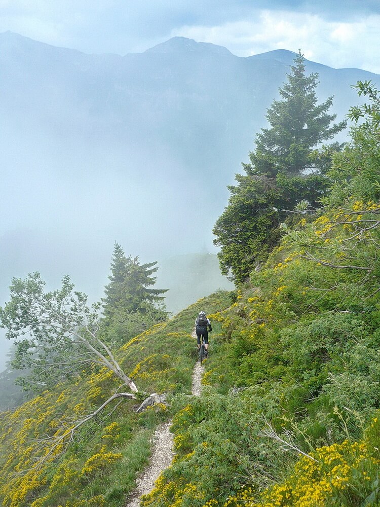 Schließlich öffnet sich ein Durchgang, der zum Kammweg auf der anderen Seite führt. Wir nehmen diese breite Schotterpiste dankend an und erreichen fahrenderweise das Gipfelkreuz des Monte Maggio. Leider ist die Sicht - wie hier fast immer - durch Nebelschwaden eingeschränkt. Sie entstehen durch die feuchten Luftmassen, die aus der venetischen Tiefebene gegen den Berg drücken. Zumindest erhaschen wir einige Blicke auf das Pasubio-Massiv, dass noch stark mit Schneefeldern gesprenkelt ist und auf der anderen Talseite zu sehen ist. Jetzt folgt ein Leckerbissen, die spektakuläre Trailabfahrt zum Passo Borcola. Je nach Traute und Fahrtechnik lassen sich ein paar Schiebestellen kaum vermeiden, auch weil es einige ausgesetzte Passagen gibt. Im Großen und Ganzen aber ein Traumtrail, der auch mit Transalprucksack keine unüberwindliche Schwierigkeit darstellt. Leider wird in diesem Jahr der Fahrfluss etwas gebremst. Einige Bäume und Sträucher konnten der enormen Schneelast des vergangenen Winters nicht standhalten und sind umgeknickt.