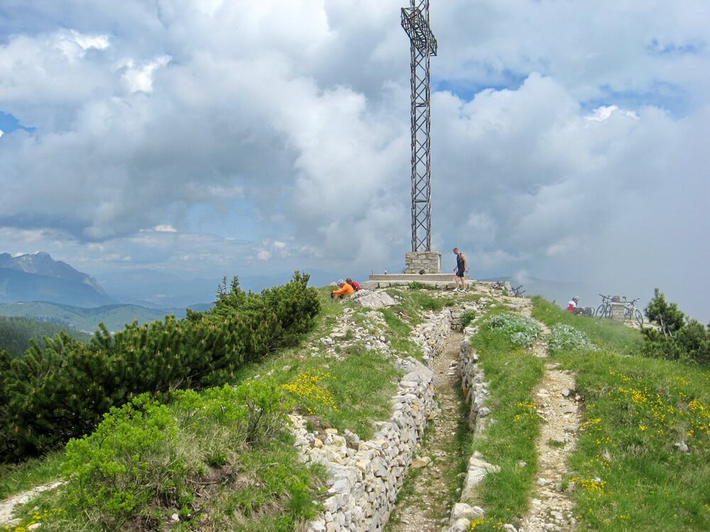 05 350 IMG 1903Gestern Abend haben wir im Fernsehen den gruseligen Wetterbericht aus Österreich und Deutschland gesehen. Wir frohlocken, der geht uns hier nichts an. Vor uns funkeln die Berge in der Morgensonne. Von der Terrasse unseres Hotels sehen wir schon das markante Eisenkreuz, das den Gipfel des Monte Maggio markiert. Das ist eines unserer Zwischenziele am heutigen Tage. Heute geht es zur Abwechslung gleich mit einer Schotterpiste los. Wir drehen eine Ehrenrunde noch zum Monte Rust, das ein Ossarium beherbergt - also die knöchernen Überreste der gefallenen Soldaten des 1. Weltkrieges in dieser Gegend. Leider ist der abkürzende Trail hinab nach Carbonare verfallen und durch umgestürzte Bäume nicht befahrbar. Wir rollen also wieder ein Stück dieselbe Strecke zurück und folgen dann der Ausschilderung des MTB - Weges nach Carbonare. Damit das nicht zu schnell geht, habe ich kurz nacheinander zwei Reifenpannen. Beim ersten Mal flicke ich noch versuchsweise mit dem Parktool-Zeug. Bei der nächsten Abfahrt ist der Reifen wieder platt. Die Flicken haben nicht gehalten, was sie versprechen. Jetzt aber den neuen Schlauch rein, ordentlich aufgepumpt und Ruhe hat's bis zum Gardasee.