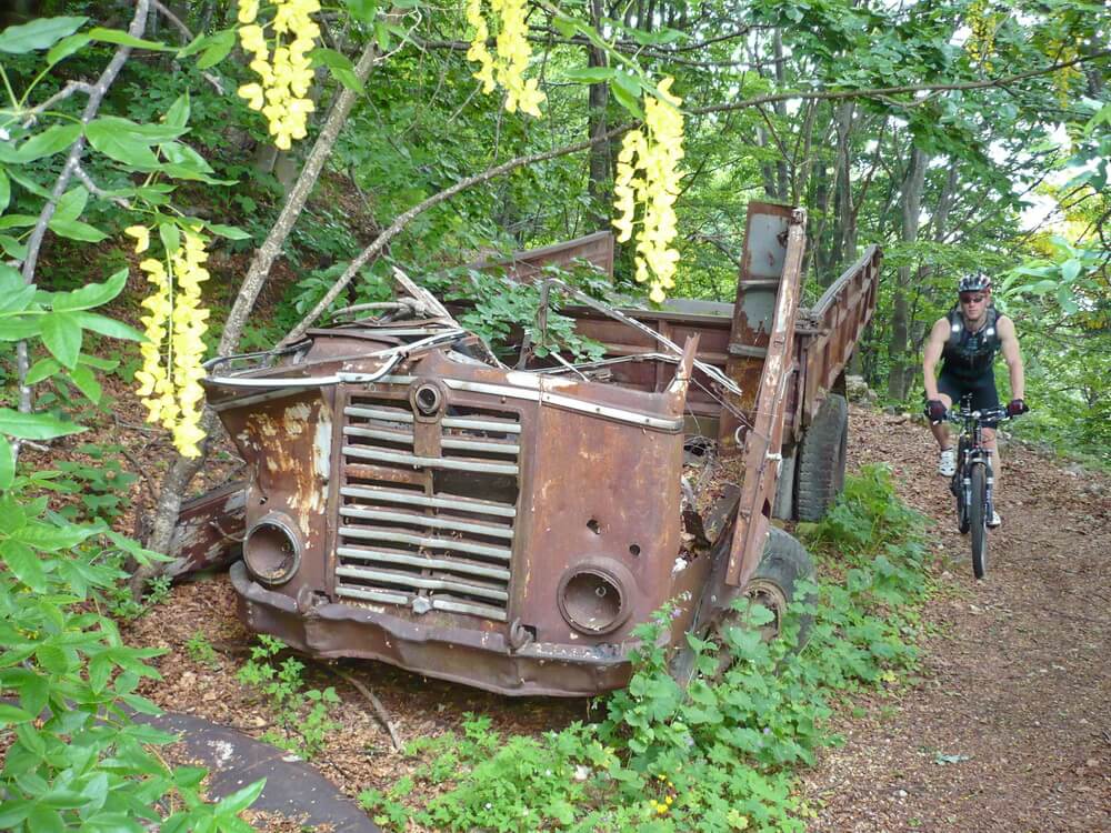 Schließlich erreichen wir in der Nähe des alten Steinbruchs das legendäre Wrack des zurückgelassenen LKW. Hier fragt sich jeder, wie der einmal hier hochgekommen ist. Inzwischen ist auch die Fahrerkabine zertrümmert. Allerdings trotzen noch einige stabile Eisenteile dem unaufhaltsamen Verfall. Nach dem LKW wird der Trail breiter, bleibt aber steil, bis wir über eine Wiese am Passo Borcola auf die Straße gelangen. Wir verlieren ein paar hundert Höhenmeter auf der Straße hinab nach Süden, die wir uns auf den schmalen Sträßchen zum Collo Xomo wieder hart erarbeiten müssen. Zum Glück hat das Rifugio an der Passhöhe geöffnet und wir nehmen ein spätes Mittagessen zu uns. Verlassen sollte man sich nicht darauf, dass dieses Rifugio immer geöffnet hat.