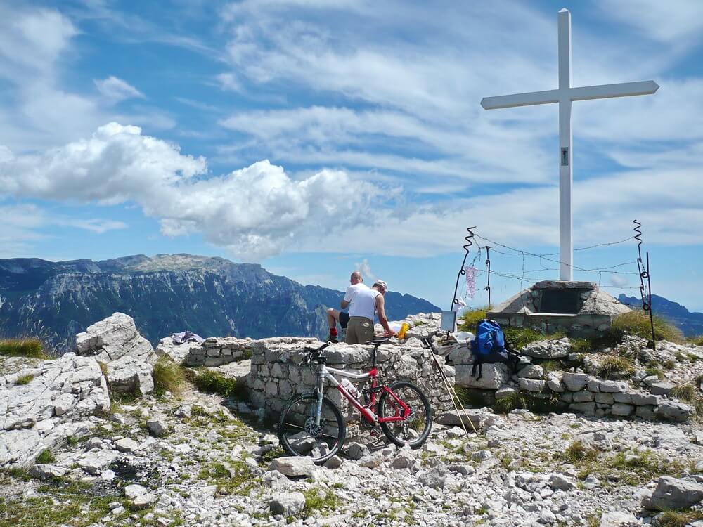 Bald sind wir in Albaredo. Hier beginnt die schöne Auffahrt auf einer alten inzwischen asphaltierten Militärstraße. Die Steigung ist moderat und relativ gleichmäßig. Rampen gibt es keine bis zur Rifugio Monte Zugna, dass sich in schöner Aussichtsposition auf einer Höhe von 1616 Metern befindet. Das Etschtal liegt uns zu Füßen und gegenüber - scheinbar auf Augenhöhe - das Monte Baldo-Massiv. Im Rifugio könnte man auch übernachten, wenn man sich die Etappen anders einteilt. Vorherige telefonische Reservierung ist sinnvoll. Wir machen Rast, füllen die Wasserflaschen auf und nehmen nun die Schotter-Rampen in Angriff, zwar nicht sehr grob, aber zäh. Gänzlich unfahrbar ist der kurze Abstecher zum Gipfelkreuz des Monte Zugna. Bei klarer Sicht (die hatte ich hier schon mal) kann man bis zur Lagune von Venedig sehen. Heute tummeln sich einige Wolken in der schwülwarmen Luft. In der Ferne grummelt es.