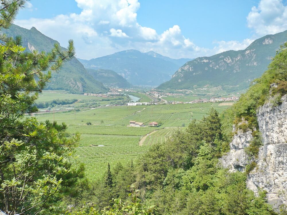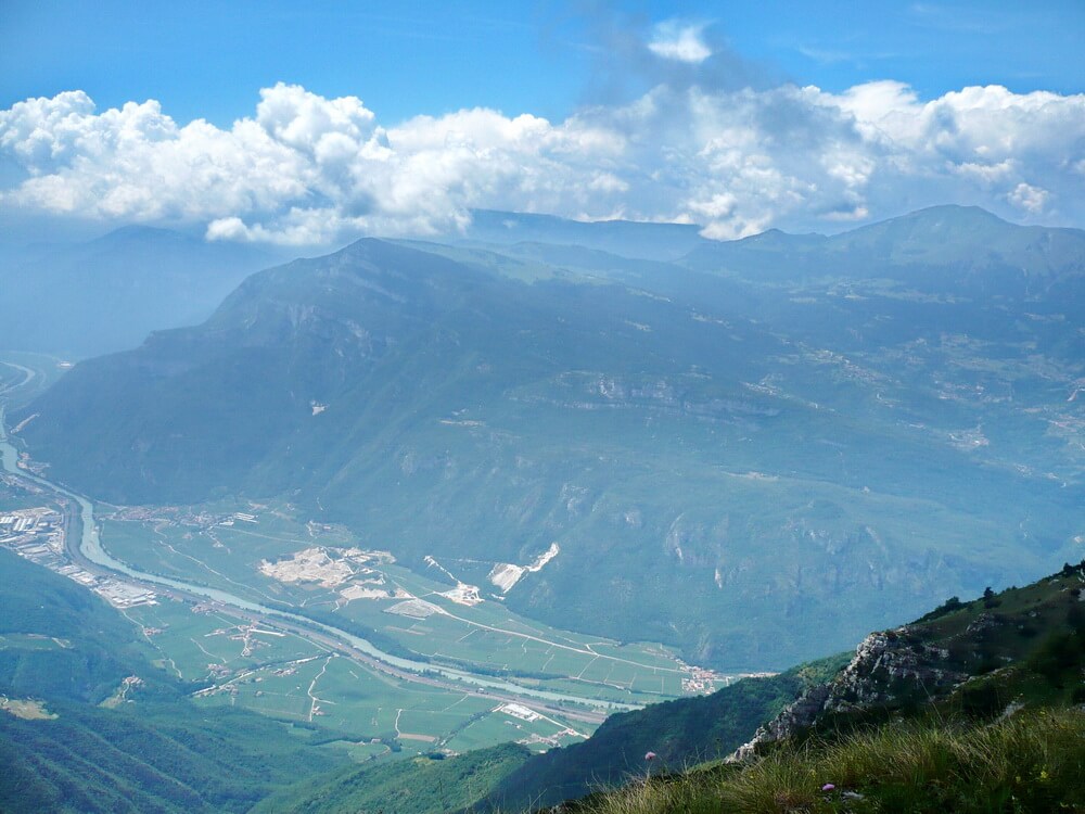 Wir halten uns deshalb nicht länger als nötig auf und machen uns an die Abfahrt, die nun wirklich gigantisch ist. So wünscht man sich das auf einer Transalp. Rund 1500 Höhenmeter werden wir auf Trails und Schotterpisten hinab ins Etschtal vernichten. Der spektakuläre Auftakt ist ein zum Trail verfallener alter Militärweg, der noch mit größeren Steinen gewürzt ist. Viele werden ihn komplett fahren können. Nach einer etwas steileren Passage geht der Trail in einen Pfad über, der meist leicht abfallend und flüssig fahrbar zum Passo Buole führt. Der oft strapazierte Begriff Traumsingletrail hat hier seine Berechtigung. Am Pass erläutern dann diverse Schautafeln, welchen Irrsinn die Militärs im Ersten Weltkrieg hier betrieben haben. Wir können uns an der einzig sinnvollen Hinterlassenschaft erfreuen, der Schotterabfahrt in Richtung Etschtal. Kein Gegenanstieg trübt das Vergnügen, zu dem ist die Piste vor kurzem scheinbar ein wenig ausgebessert worden. Wir können es so richtig krachen lassen. Ich vermute aber, dass der Untergrund nach schweren Regenfällen durchaus sehr grob werden kann. Im Etschtal empfängt uns eine schwüle Gluthitze und starker thermischer Wind, der uns flussaufwärts entgegen bläst. Ala erreichen wir auf einer kleinen Nebenstraße, die durch Weinberge führt. Ala würde sich auch als Übernachtungspunkt anbieten. Wir rollen aber noch weiter bis Avio. Dort wollen wir entscheiden, ob wir eventuell noch die Schlussetappe des morgigen letzten Transalptags verkürzen, in dem wir noch ein paar Höhenmeter hinauf zur Ostflanke des Monte Baldos machen. Nein, in Avio ist Schluss. Es gibt erst nach weit mehr als 1000 zusätzlichen Höhenmetern Übernachtungsmöglichkeiten. Das wäre für uns heute des Guten zuviel. Eine Unterkunft ist schnell gefunden.