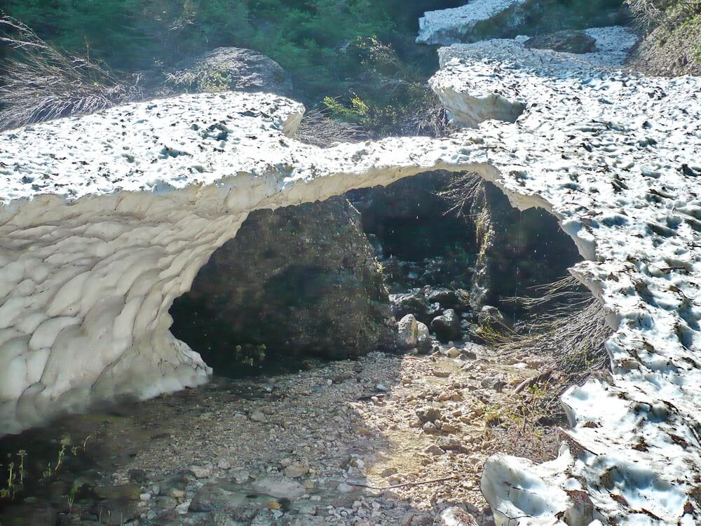 Je weiter wir rollen, desto mehr liegen Steinbrocken auf der Straße herum und die Bäume und Büsche beginnen sich ihr Terrain zurückzuholen. Des Rätsels Lösung folgt bald. Urplötzlich wird aus dem zerbröckelnden Asphaltband eine grobe Schotterpiste, die sich an den schroffen Felswänden der kleinen Dolomiten entlang zieht. Der absolute Hammer folgt in einer Kehre. Hier ist im Winter eine Lawine abgegangen und die Überreste sind Ende Juni immer noch nicht weggetaut und das in einer Höhe von knapp 1200 Metern. Ich will gerade den festgepressten Schnee vorsichtig inspizieren, als mir ein italienisches Ehepaar auf der anderen Seite signalisiert, dass ich das lieber nicht tun soll. Ich erkunde ohne Bike die Lage und klettere ein paar Meter nach oben, als ich die Bescherung sehe. Das Schmelzwasser hat den Lawinenkegel von unten ausgehöhlt. Es ist nur eine schmale Eisschneebrücke übrig. Die kann uns unter Garantie nicht mehr tragen. Jetzt schießt mir schon der Schreck in die Glieder.