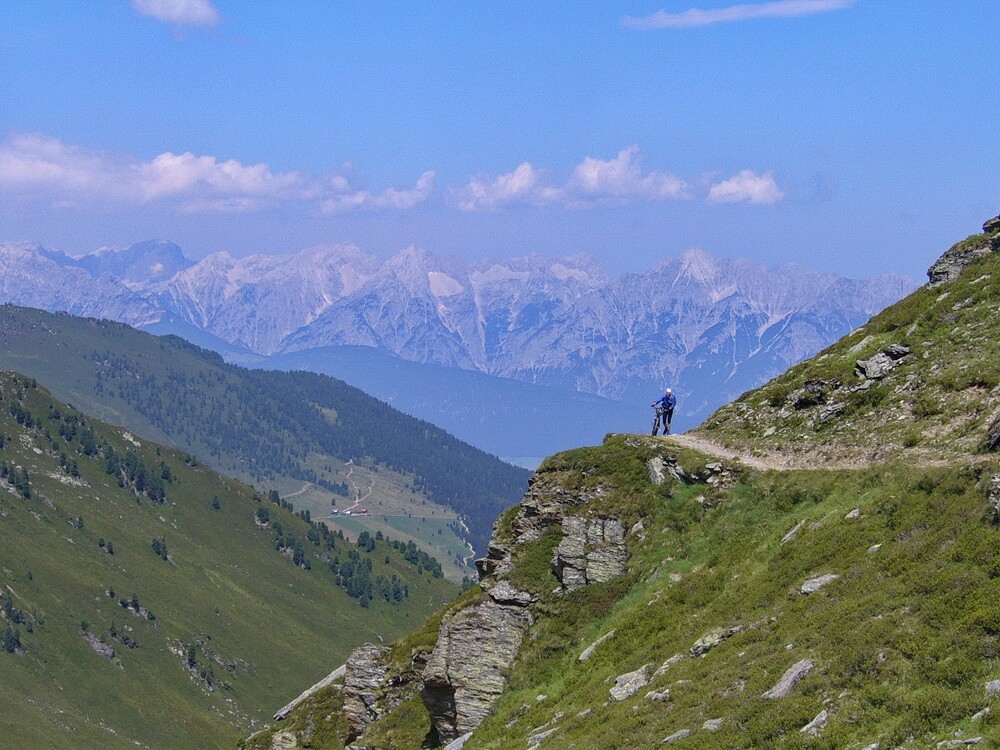 Der strahlende Morgen verheißt einen schönen Tag. Für die vor uns liegende Etappe können wir das gut gebrauchen. Es soll die Königsetappe werden, an deren Ende wir mehr als 2500 Höhenmeter in den Beinen haben werden. Los geht es mit einigen, wenigen Kilometern zum Einrollen. Auf dem Weerberger Plateau fährt es sich wie auf einem riesigen Balkon, von dem man aus weit ins Inntal schauen kann. Nach der Ortsmitte von Weerberg geht es nun langsam, aber stetig bergauf, zunächst auf Asphalt bis Innerst. Dann ein kleiner Trail bis zur Forststraße, die sich relativ moderat zur Nafingalm hinzieht. Dort ist die Weidener Hütte ein beliebter Rastpunkt und Übernachtungsort für Transalpler. Wir wollen heute allerdings so weit wie möglich kommen, weil das gute Wetter in Tirol nur einen Tag halten soll. Die Pause fällt deshalb nicht zu lange aus. Bis zum Geiseljoch sind es von hier aus noch rund 500 Höhenmeter, also eine gute Stunde. Normalerweise gehört dieser Übergang zu den ziemlich komplett fahrbaren Pässen in den Alpen. Je weiter wir aber in die Höhe gelangen, umso kräftiger wird der Wind. Auf dem schmalen Pfad zum Joch bläst er dann mit Sturmstärke direkt von vorn und versetzt mit tückischen, böigen Wirbeln. Auch wenn der Pfad nicht wirklich ausgesetzt ist, Schieben ist bei diesen Bedingungen die sicherste Variante des Vorwärtskommens. Der Gipfelsturm ist Vorbote des Wetterumschwungs. Wir halten uns nicht lange am Geiseljoch auf, genießen nur kurz das schöne Alpenpanorama und machen uns an die Abfahrt, die fast von ganz oben leicht fahrbar ist.