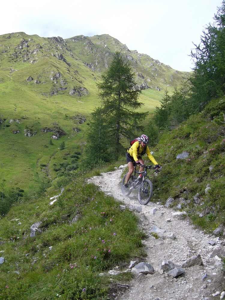 Im unteren Teil wird aus dem Almweg eine schmale Teerstraße, auf der man bis Vorderlanersbach rollen könnte. Da ich diese Strecke schon kenne, halte ich nach einer interessanteren Variante Ausschau. Mein Gefühl trügt mich nicht, als wir beim Abzweig zum Vogelnest die Fahrstraße verlassen. An der Talstation des Skilifts beginnt ein netter kleiner Trail. Der Weg 315 ist eine willkommene Abwechslung auf unserem Weg ins Tuxer Tal. Nach reichlich einem Kilometer erreichen wir wieder ein Fahrsträßchen oberhalb von Lanersbach. Ich orientiere mich kurz - aha, da biegt ja ein schmaler Wiesenpfad ab, der direkt in den Ort führt. Den fahren wir hinab und landen schließlich im Ort auf der Fahrstraße nach Hintertux.