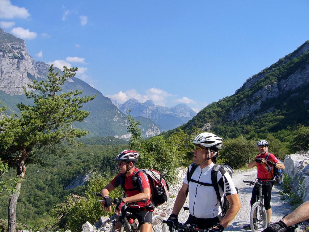 Viele Wege führen von Andalo an den Gardasee. Wir horchen beim Frühstück am Morgen tief in uns hinein und hören übereinstimmend folgendes: Oh Herr, beschere uns eine schöne, aber nicht zu anstrengende letzte Etappe. Dem Wunsch kann entsprochen werden. Vor Jahren bin ich ohne großes Nachdenken einfach die Straße hinunter nach Molveno gerollt. Das muss auch besser gehen, denke ich mir und schaue in die Karte. Neben der Straße schlängelt sich offenkundig ein Wanderweg zum Lago Molveno. Aha, das sollte passen. Zufällig kommt gerade eine junge, attraktive Italienerin des Weges. Eigentlich frage ich lieber ältere Herren mit Hund, die wissen immer Bescheid, wo es langgeht. Aber was soll ich machen? Mangels einer Alternative muss ich die junge Frau fragen. "Ja, gleich am Ortsausgang von Andalo geht links der Wanderweg ab. Da ist auch ein Schild", verstehe ich und bedanke mich für die Auskunft: "Grazie mille e buon giornata, signora." Der Wanderweg ist schnell gefunden und wirklich eine sinnvolle, schöne Alternative zur Fahrt auf der Straße. Auf diese stoßen wir erst wieder am Lago Molveno. Wir können sie aber vermeiden und umrunden den See auf der Gegenseite. Das stellt sich als reizvolle Variante heraus. Nach der Staumauer rollen wir weiter bergab bis Nembia, queren wieder die Straße und erreichen nach einem kurzen Trailstück die Schotterpiste nach Ranzo. In der Tendenz geht es bergab, ein paar kleinere Gegenanstiege gibt es schon noch. In der Gegenrichtung bin ich diesen Weg schon einmal gefahren und weiß, dass es eine landschaftlich schöne Strecke ist. Wir begutachten von oben den tiefen Einschnitt, den der Fluss Sarca in den Fels gegraben hat und machen auch die Piste zum Passo della Morte am Monte Casale vor uns aus.