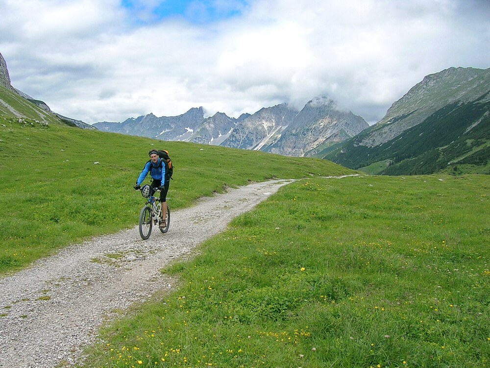 Bei der Anfahrt am Freitag Nachmittag nach München schien noch die Sonne vom strahlend blauen Himmel und es war drückend heiß. Doch das Wetter sollte sich umstellen. Am Morgen des Samstags ist der Himmel schon bedeckt, als wir mit dem Auto nach Mittenwald fahren. Anders als zum Beispiel in Oberstdorf gibt es in Mittenwald kostenfreie Dauerparkplätze für Mountainbiker: aktuelle Informationen erhält man in der Tourismusinformation. Schnell ist man dann auf dem Radweg Richtung Scharnitz. Der verläuft entlang der Isar und bietet eine schöne Einrollstrecke. Noch hält das Wetter. David und ich radeln gemütlich los und sind in kurzer Zeit in Scharnitz, dem Eingang ins Karwendeltal. Das ist schon ein beeindruckender Start einer Transalp. Sofort umfängt einen alpines Ambiente auf dem leicht zu fahrenden Schotterweg Richtung Karwendelhaus. Eine Einkehr dort schenken wir uns, da wir nicht wissen, ob es nicht zu regnen anfängt. Über den Hochalmsattel geht es zügig hinab zum Kleinen Ahornboden und durch die Schluchtstrecke des Johannestals weiter ins Rißbachtal. Dort beginnt die mäßig ansteigende Mautstraße zum Großen Ahornboden und der Engalm. Wir wollen über das Lamsenjoch, da ich auf dieser Transalp auch für das Roadbook zur DVD "Abenteuer Alpencross" www.abenteuer-alpencross.de recherchiere. Nach einer kurzen Rast an der Engalm beginnt ein steiler Aufstieg zur Binsalm und weiter zum Westlichen Lamsenjoch. Obwohl der Weg hergerichtet wurde, wird er wohl nicht für jeden komplett fahrbar sein.