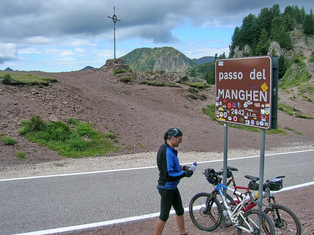 Heute ist die Route klar und eindeutig. Manghenpass, Val Sugana und von dort aus zur Hochebene der Sette Comuni. Nach dem reichhaltigen Frühstück geht es ohne viel Federlesen gleich bergauf. Den Manghenpass erreicht man unspektakulär auf einer wenig befahrenen Asphaltstraße. Ab und zu passiert uns ein einsames Auto oder eines der wohl unvermeidlichen stark motorisierten Bikes der anderen Fraktion, die sich in den Alpen tummelt. Wie dem auch sei, uns ist heute diese leichte Variante recht, denn ich weiß nicht so recht, was uns bei der noch folgenden Auffahrt zum Rifugio Barricata noch erwartet. Doch zunächst versägen wir die gewonnenen Höhenmeter weicheimäßig auf der Asphaltpiste runter ins Val Sugana, wo uns die übliche Sommerhitze empfängt, die ich von meinen Transalps in den letzten Jahren gewohnt bin. Bevor die Läden gegen zwölf Uhr zur Siesta dicht machen, versorgen wir uns in Scurelle in einem kleinen Spar-Markt mit Essen und Trinken und rasten im Schatten. Die Zeitplanung ist optimal, wie sich herausstellen sollte. Bis Selva ist es nur ein Katzensprung, davon die letzten Kilometer auf dem Radweg.