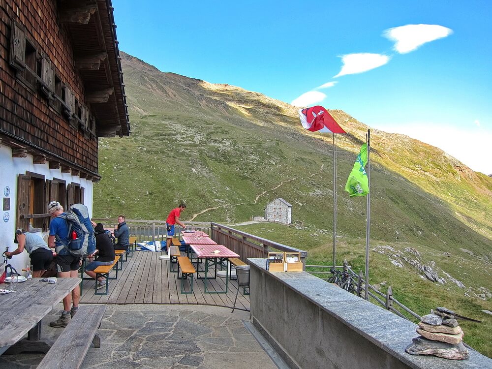 Wir haben uns inzwischen weiter nach oben geschraubt und passieren die Pfaffenseen. In der Nähe der Plantapatsch-Hütte gelangen wir auf den Höhenweg, der sich zur Sesvenna-Hütte hinzieht. Wir befinden uns hoch über dem Schliniger Tal. Da hier ein Lift Wanderer in die Höhe befördert, muss man bei gutem Wetter mit einigen Wanderern auf der Strecke rechnen. Mit der gebotenen Rücksicht sollte es keine Probleme geben, zumal man das Rad bei einigen kleinen Gegenanstiegen schieben muss. Der Weg zieht sich schon hin, das Panorama entschädigt für die kleine Mühsal. Schließlich erreichen wir die Sesvenna-Hütte am späten Nachmittag. Mein Tagesziel für heute ist erreicht. Dirk fährt noch ins Tal ab, ins Urlaubsdomizil seiner Familie. Morgen will er in aller Frühe wieder da sein, um mit mir gemeinsam das Val d'Uina zu durchqueren.