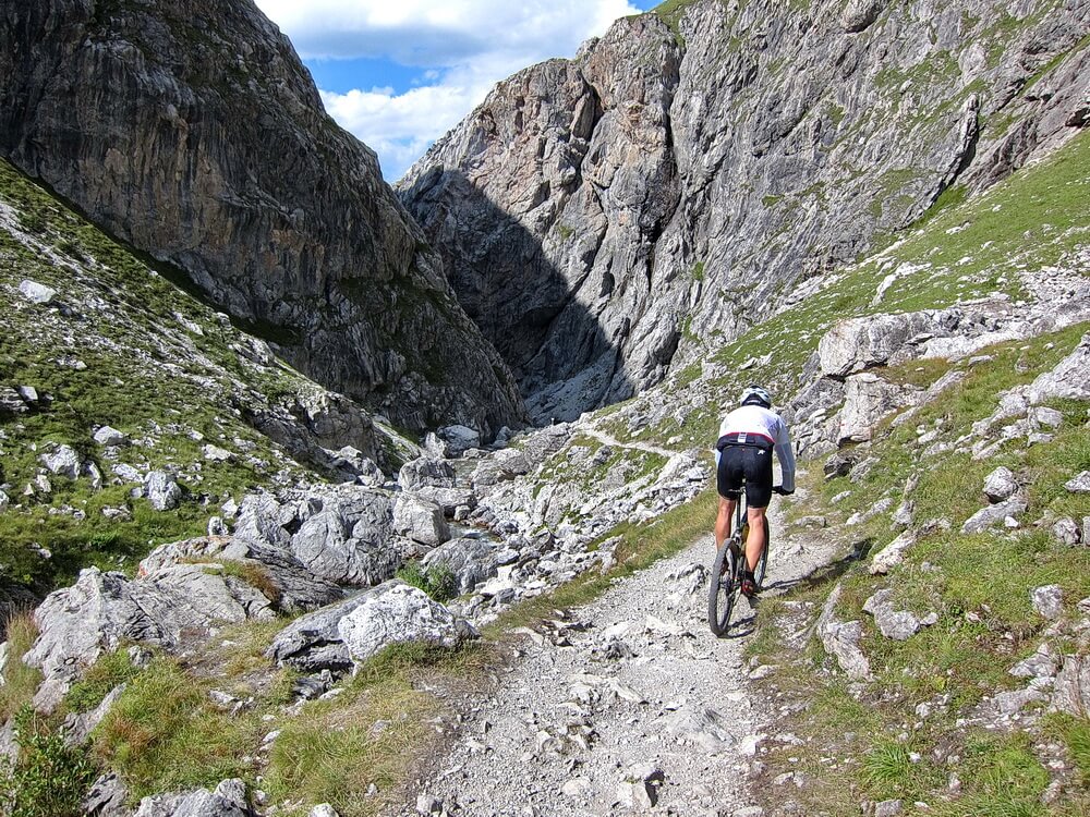 Die Rampe ist fahrbar, jedenfalls für Dirk, der ohne Rucksack unterwegs ist. Ich habe Gepäck dabei und mein Rad wiegt vielleicht fünf Kilogramm mehr als das von Dirk, das ein Kampfgewicht von unter acht Kilogramm aufweist. Trotzdem ist das Cannondale transalptauglich. Dirk weiß, was er tut, wenn er sein Bike tunt. Sein Spruch lautet: "Man muss über jede Schraube nachdenken." Das macht Dirk mit Sinn und Verstand, bei der Sicherheit gibt es keine Kompromisse. Wenn er wollte, könnte er diese Marktnische professionell ausfüllen. Will er aber nicht, lieber sind ihm entspannte Transalptouren. Da hat er Recht.