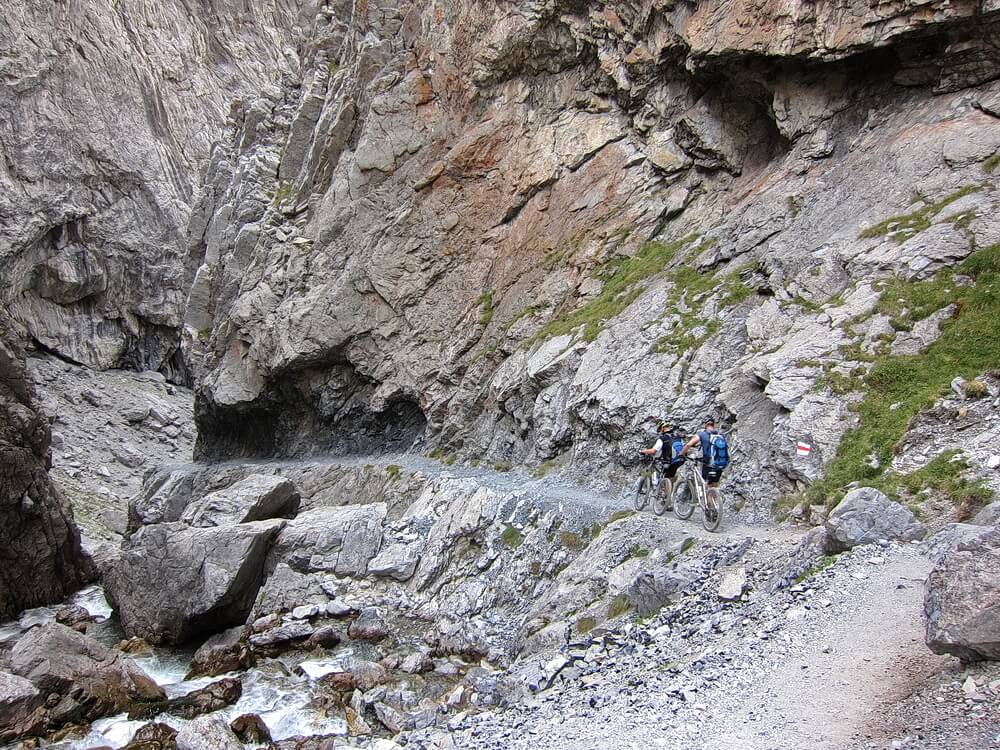 Der nächste Tag war streng und lang, denn wir übernachteten erst in Scuol (Hotel Bellaval). Der Tag begann angenehm mit der Fahrt Sclamischot, Nauders und Reschenpass. Der Anstieg vom Haidersee zu den Pfaffenseen hatte es in sich. Der Höhenweg zur Sesvenna-Hütte zwang uns oft zum Absteigen. Das Verbot für Fahrräder haben wir missachtet, wir waren ja mit Mountain-Bikes unterwegs. Die Uina-Schlucht haben wir zum ersten mal mit dem Fahrrad durchquert. Sie ist immer wieder beeindruckend.