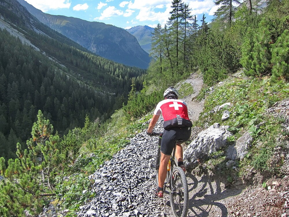 Wie schon bei der Via Crux Albi nutzt Dirk seinen Familienurlaub in Südtirol, um mich auf einem Abschnitt meiner Transalp zu begleiten. Das geschieht bei einem Schönwetterfenster, um mit leichtem Gepäck oder gar keinem unterwegs sein zu können. In Kombination mit seinem auf extremen Leichtbau getrimmten Cannondale ist er mir bergauf natürlich haushoch überlegen. Aber darauf kommt es nicht an. Wichtig ist, dass wir heute eine sehr eindrucksvolle, alpine Etappe gemeinsam fahren werden. Die Strecke hatte ich schon vorher ausgetüftelt. Heute fahren wir sie bei bestem Wetter am Stück. Los geht es in Pfunds mit einer lockeren Einrollstrecke ab Pfunds auf dem Innradweg bis zur Kajetansbrücke. Hier gibt es einen Radweg flussaufwärts entlang des Inns. Dadurch können wir ein Stück der Straße nach Martina in der Schweiz vermeiden. In der Nähe des alten Innübergangs Altfinstermünz müssen wir dann doch auf die Straße wechseln. Der Inn hat hier einen Canyon in den Fels gegraben, an dessen Rand beim besten Willen kein Platz für einen Pfad ist. Zügig rollen wir nach dem Ort Vinadi hinunter nach Martina. An der Schweizer Grenzstation interessiert sich für uns Mountainbiker kein Mensch. Mit einem Kopfnicken werden wir durchgewunken. Die Straßenvariante über die Norbertshöhe nach Nauders verkneifen wir uns heute, wir wollen uns ein wenig mehr quälen. Dazu wählen wir die steile Auffahrt von Sclamischot in Richtung Nauders. Im kleinen Ort verlassen wir also den Innradweg, es geht auf der MTB-Route bald straff bergauf. Im Bereich der grünen Grenze zwischen der Schweiz und Österreich gibt es einen kurzen Trailabschnitt, ehe wir wieder auf einer Schotterpiste in Richtung Mösle rollen. Hier gibt es wieder einen kleinen Trail, der uns auf der Straße kurz vor Nauders ausspuckt. Die Via Claudia hat uns wieder.